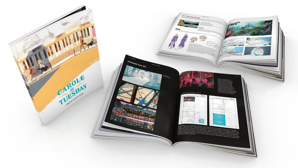 Carole & Tuesday contains episodes 1-24 of the anime directed by Shinichiro Watanabe plus a 168 Page Book, 4 Art Cards, and a Button Pack all housed in a Chipboard Box.