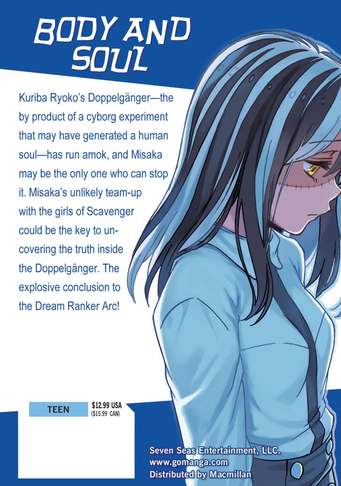 Kuriba Ryoko’s Doppelgänger–the by product of a cyborg experiment that may have generated a human soul–has run amok, and Misaka may be the only one who can stop it. Misaka’s unlikely team-up with the girls of Scavenger could be the key to uncovering the truth inside the Doppelgänger. The explosive conclusion to the Dream Ranker Arc!