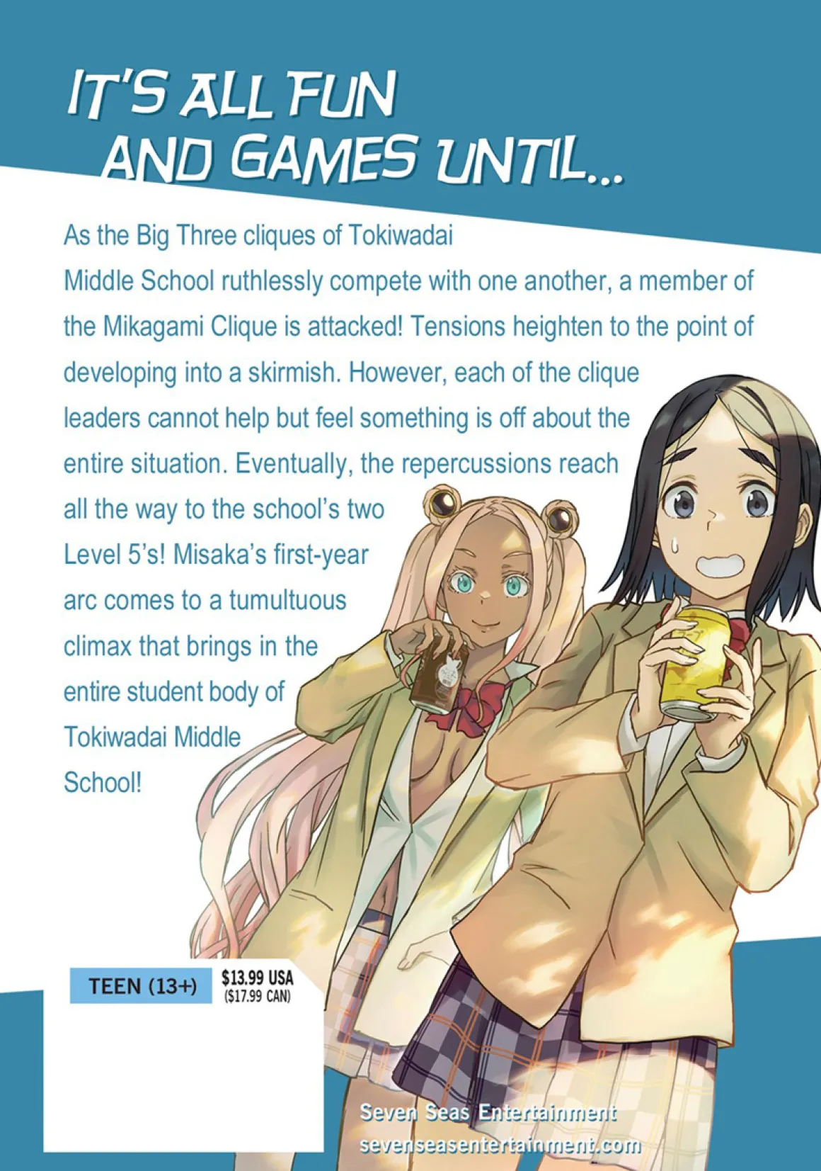 As the Big Three cliques of Tokiwadai Middle School ruthlessly compete with one another, a member of the Mikagami Clique is attacked! Tensions heighten to the point of developing into a skirmish. However, each of the clique leaders cannot help but feel something is off about the entire situation. Eventually, the repercussions reach all the way to the school’s two Level 5’s! Misaka’s first-year arc comes to a tumultuous climax that brings in the entire student body of Tokiwadai Middle School!