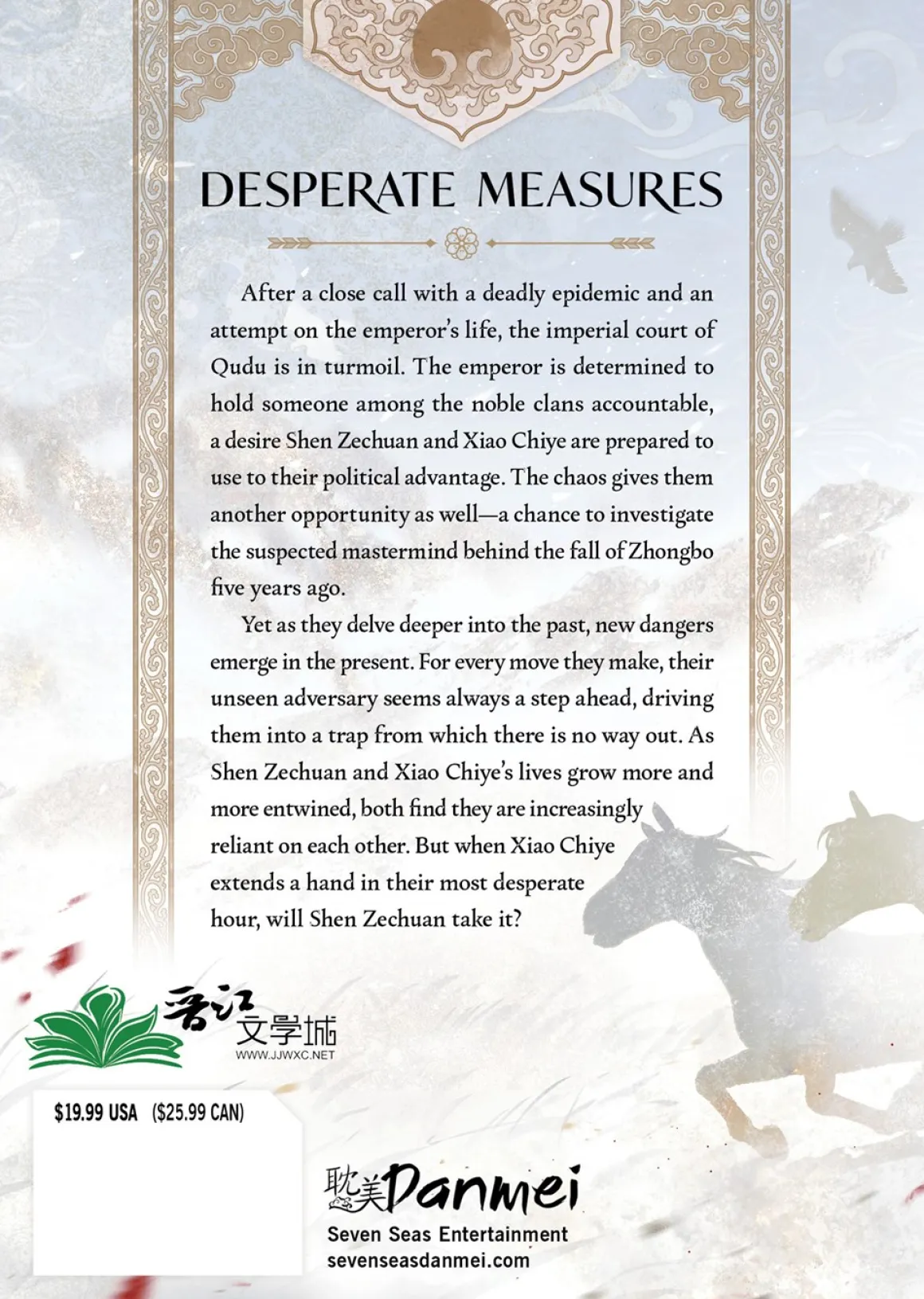 After a close call with a deadly epidemic and an attempt on the emperor’s life, the imperial court of Qudu is in turmoil. The emperor is determined to hold someone among the noble clans accountable, a desire Shen Zechuan and Xiao Chiye are prepared to use to their political advantage. The chaos gives them another opportunity as well—a chance to investigate the suspected mastermind behind the fall of Zhongbo five years ago.