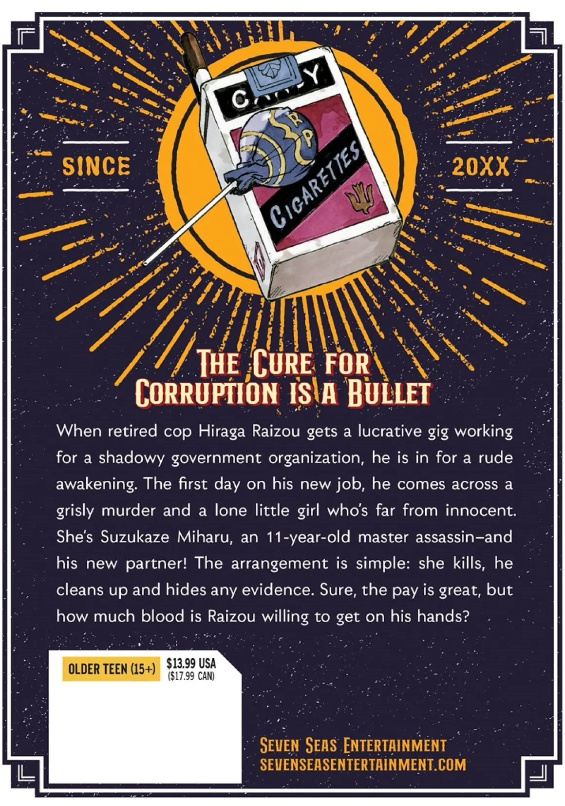 When retired cop Hiraga Raizou gets a lucrative gig working for a shadowy government organization, he is in for a rude awakening. The first day on his new job, he comes across a grisly murder and a lone little girl who’s far from innocent. She’s Suzukaze Miharu, an 11-year-old master assassin–and his new partner! The arrangement is simple: she kills, he cleans up and hides any evidence. Sure, the pay is great, but how much blood is Raizou willing to get on his hands?
