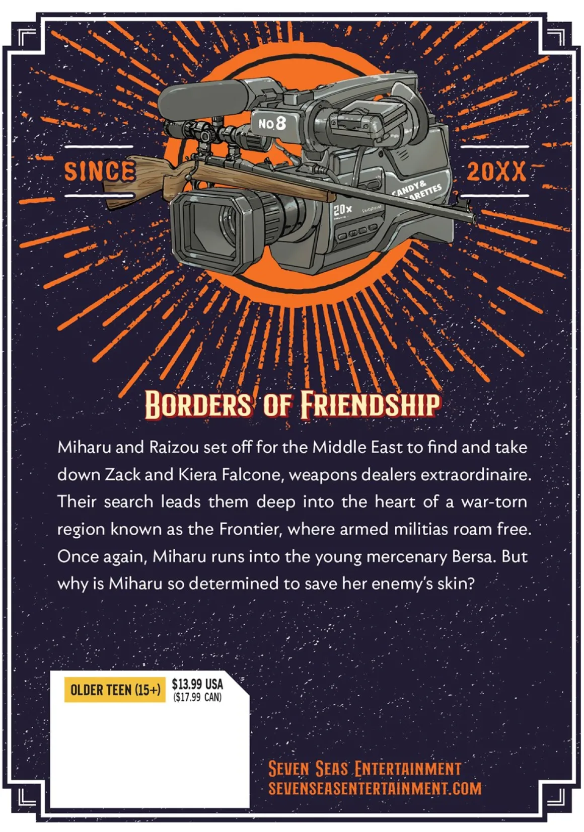 Miharu and Raizou set off for the Middle East to find and take down Zack and Kiera Falcone, weapons dealers extraordinaire. Their search leads them deep into the heart of a war-torn region known as the Frontier, where armed militias roam free. Once again, Miharu runs into the young mercenary Bersa. But why is Miharu so determined to save her enemy’s skin?