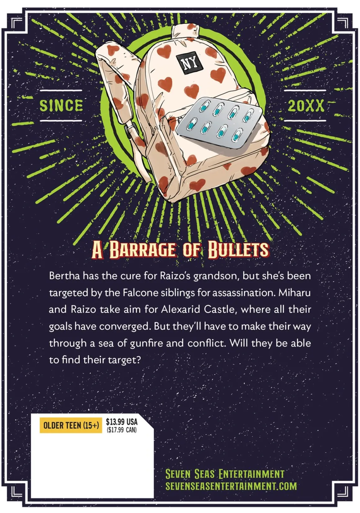 Bertha has the cure for Raizo’s grandson, but she’s been targeted by the Falcone siblings for assassination. Miharu and Raizo take aim for Alexarid Castle, where all their goals have converged. But they’ll have to make their way through a sea of gunfire and conflict. Will they be able to find their target?