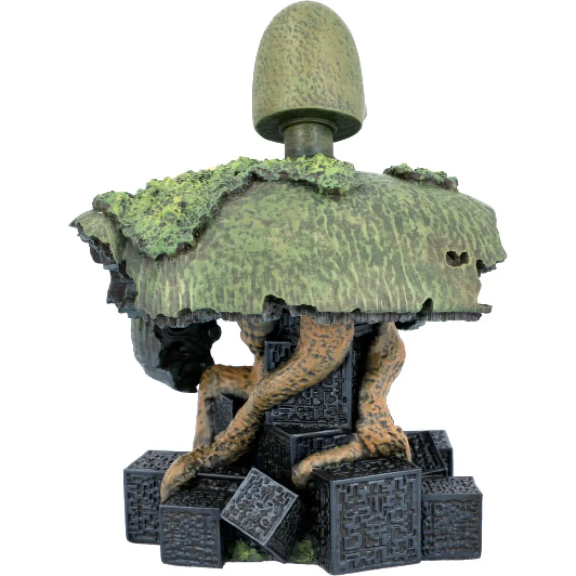 The upper torso of a robot soldier of Laputa rests upon tree trunks and Laputa cubes.