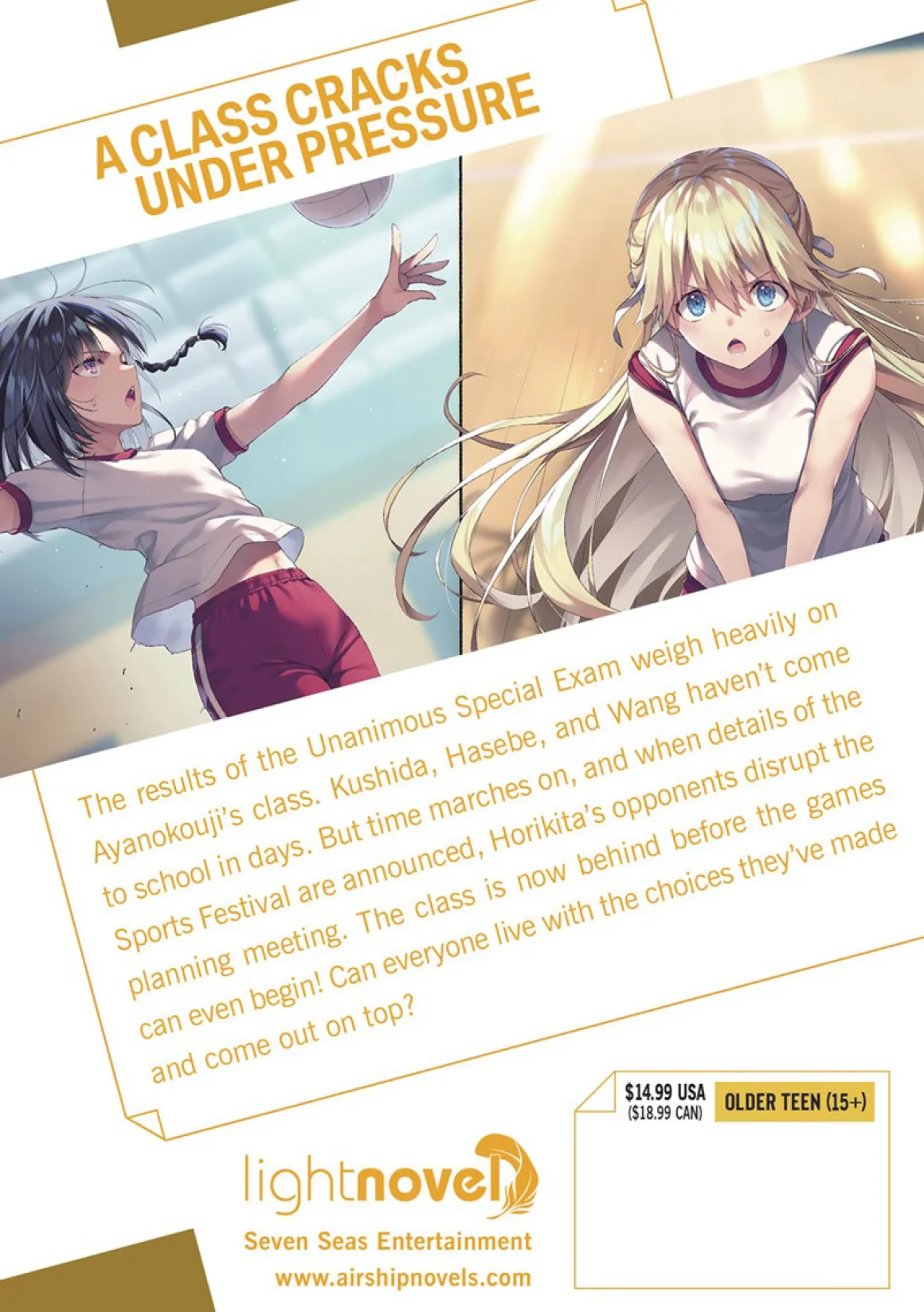 The results of the Unanimous Special Exam weigh heavily on Ayanokouji’s class. Kushida, Hasebe, and Wang haven’t come to school in days. But time marches on, and when details of the Sports Festival are announced, Horikita’s opponents disrupt the planning meeting. The class is now behind before the games can even begin! Can everyone live with the choices they’ve made and come out on top?