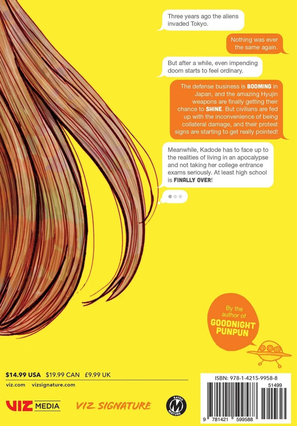 The defense business is booming in Japan, and the amazing Hyujin weapons are finally getting their chance to shine. But civilians are fed up with the inconvenience of being collateral damage, and their protest signs are starting to get really pointed! Meanwhile, Kadode has to face up to the realities of living in an apocalypse and not taking her college entrance exams seriously. At least high school is finally over!