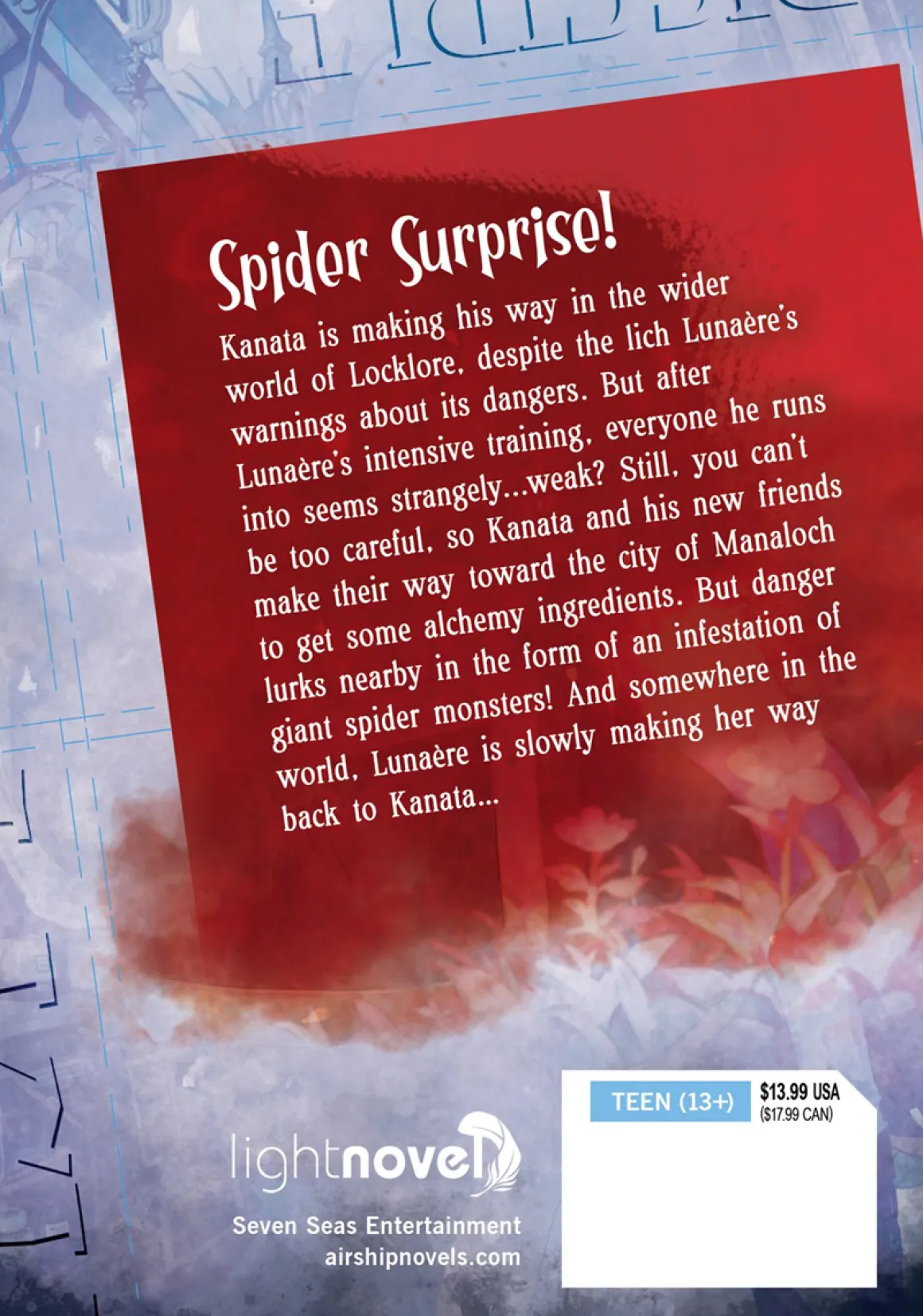 Kanata is making his way in the wider world of Locklore, despite the lich Lunaère’s warnings about its dangers. But after Lunaère’s intensive training, everyone he runs into seems strangely…weak? Still, you can’t be too careful, so Kanata and his new friends make their way toward the city of Manaloch to get some alchemy ingredients. But danger lurks nearby in the form of an infestation of giant spider monsters! And somewhere in the world, Lunaère is slowly making her way back to Kanata…