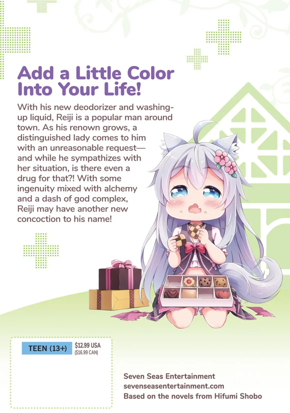 With his new deodorizer and washing-up liquid, Reiji is the popular man around town. As his renown grows, a distinguished lady comes to him with an unreasonable request—while he sympathizes with her situation, is there even a drug for that?! With some ingenuity mixed with alchemy and a dash of god complex, Reiji may have a another new concoction to his name!