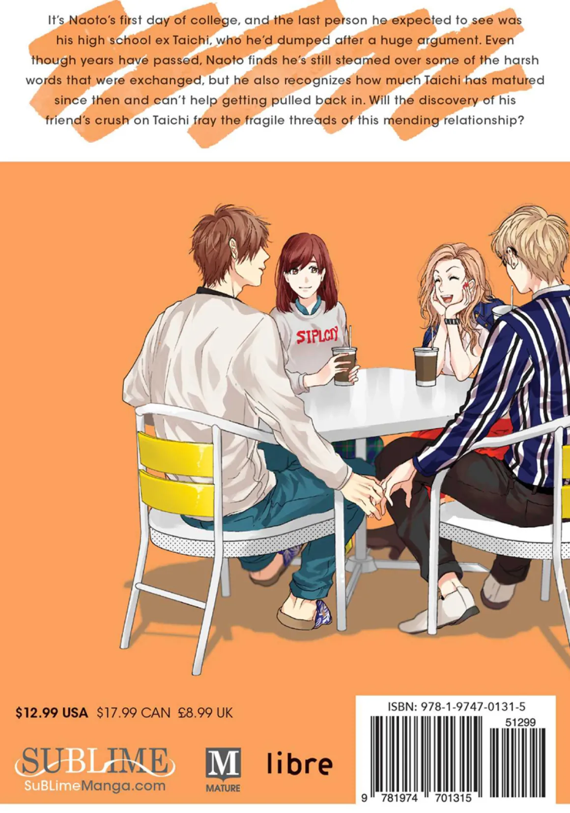 It’s Naoto’s first day of college, and the last person he expected to see was his high school ex Taichi, who he’d dumped after a huge argument. Although years have passed, Naoto finds he’s still steamed over some of the harsh words that were exchanged. Even so, he can’t help but recognize how much Taichi has matured since then, and soon old feelings begin to stir. Will the discovery of his friend’s crush on Taichi further fray the threads of this tattered but mending relationship—or strengthen the ties that bind?