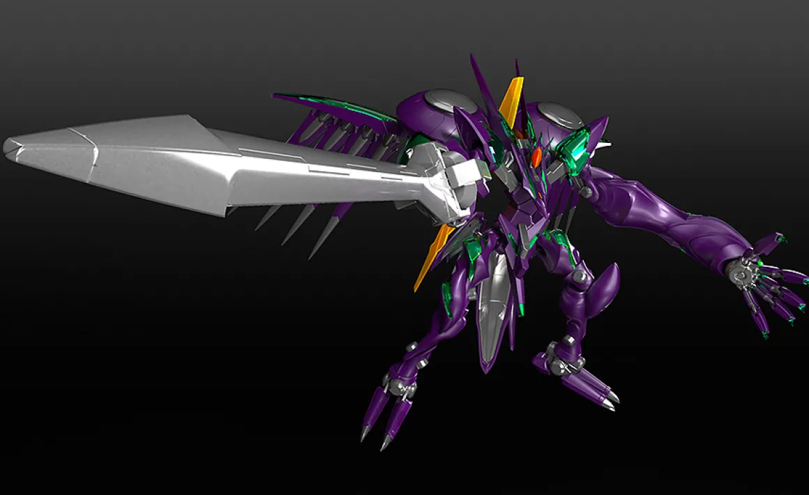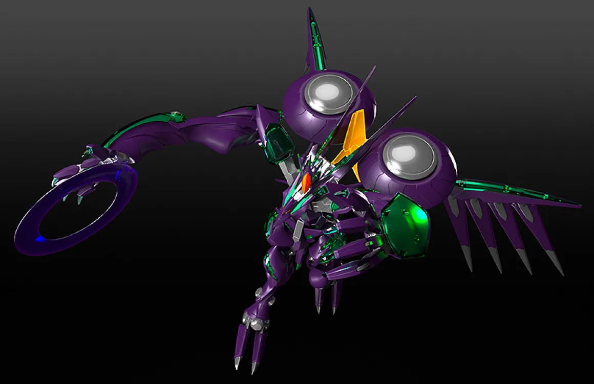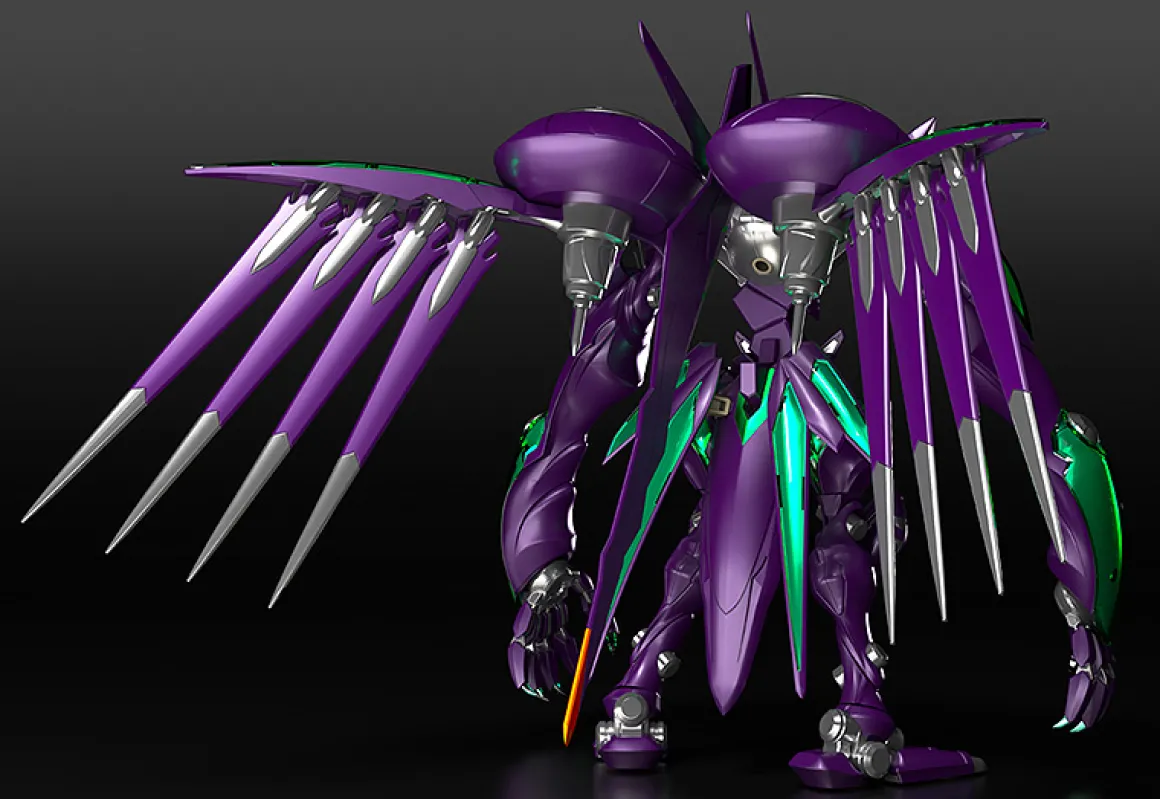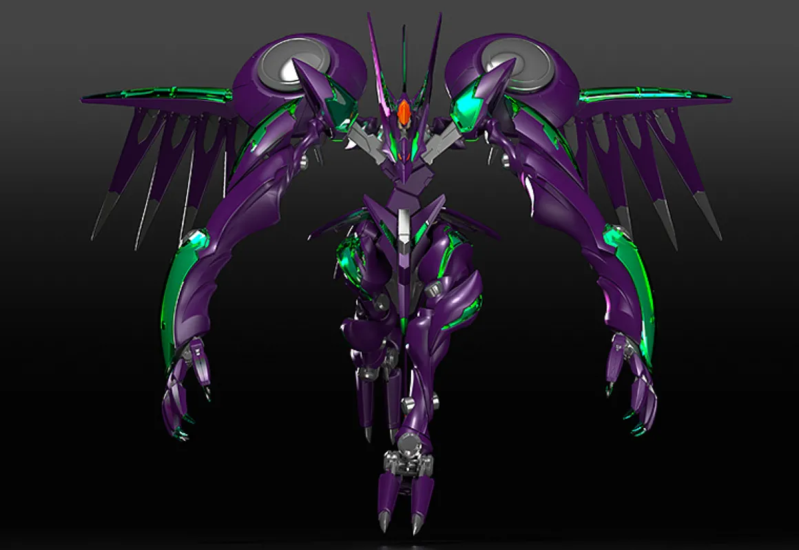 The model features fully articulated joints. Eight assimilation cables, a Luger Lance, a Luger Lance firing effect part, a Worm Ring, two back stabilizers and various replacement hand parts are included. Fafner Mark Nicht can be displayed firing its assimilation cables and deploying its homing laser oscillator. Its back stabilizers can also be displayed in standard mode or light mode. The worm ring can be equipped to its hand part.