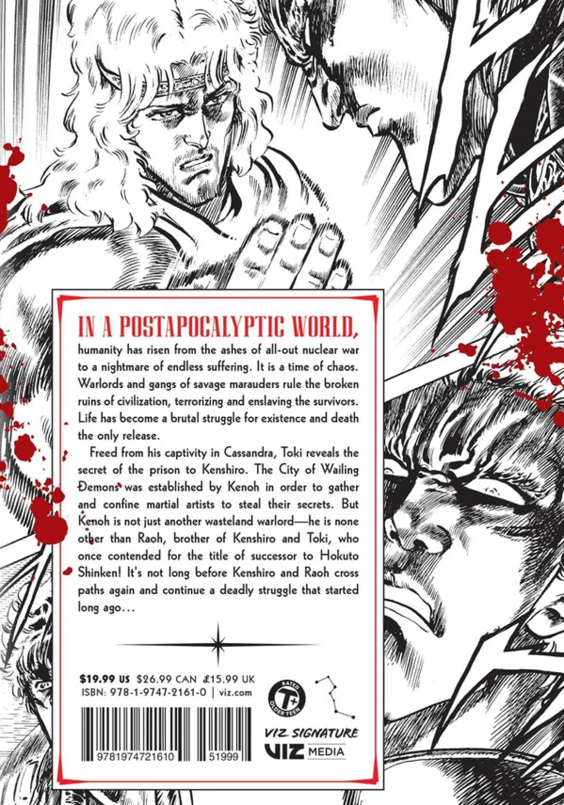Freed from his captivity in Cassandra, Toki reveals the secret of the prison to Kenshiro. The City of Wailing Demons was established by Raoh in order to gather and confine martial artists to steal their secrets. But Raoh is not just another wasteland warlord – he is none other than Kenoh, brother of Kenshiro and Toki, who once contended for the title of successor to Hokuto Shinken! It’s not long before Toki and Kenoh cross paths again and continue a deadly struggle that started long ago…