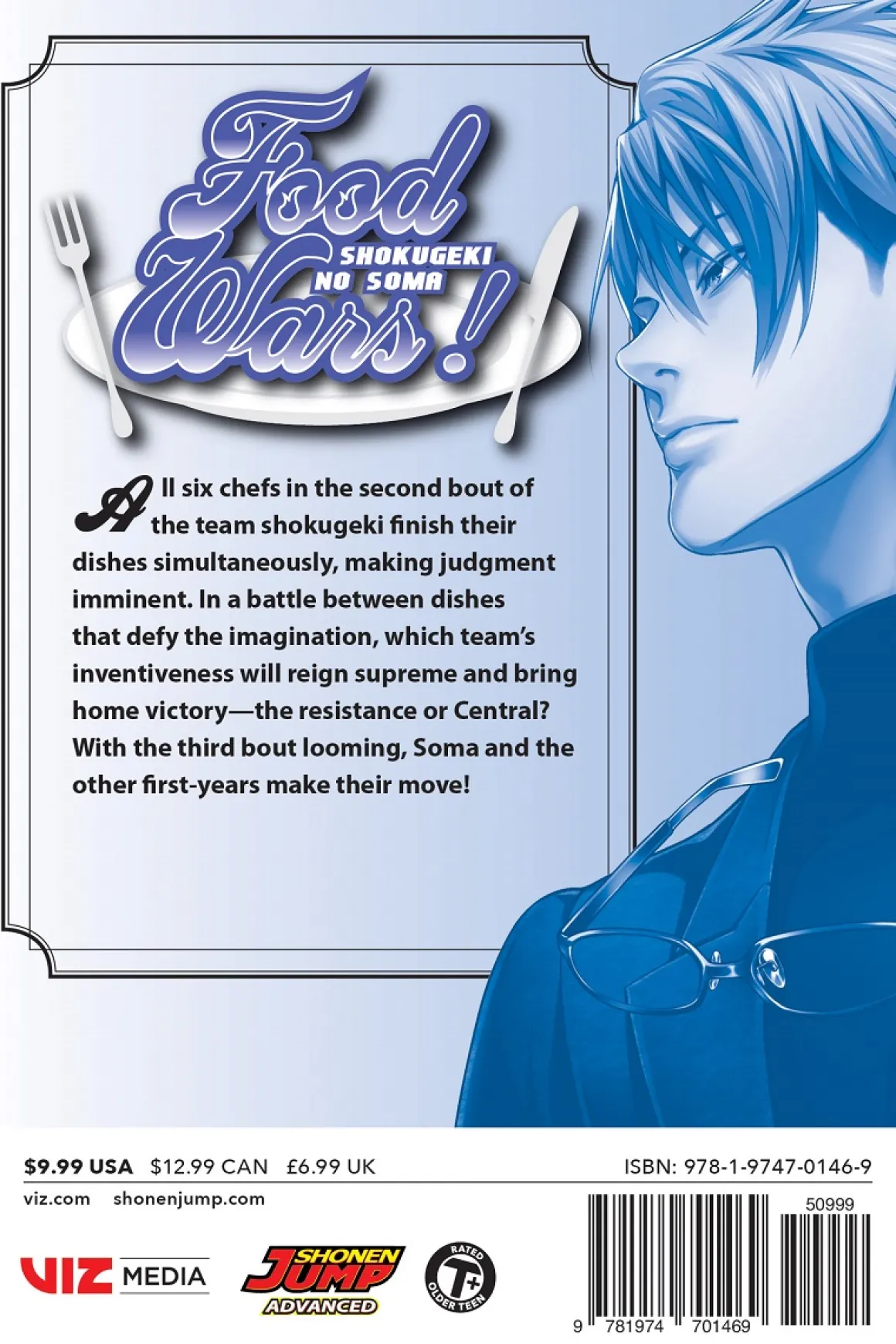 All six chefs in the second bout of the team shokugeki finish their dishes simultaneously, making judgment imminent. In a battle between dishes that defy the imagination, which team’s inventiveness will reign supreme and bring home victory—the resistance or Central? With the third bout looming, Soma and the other first-years make their move!
