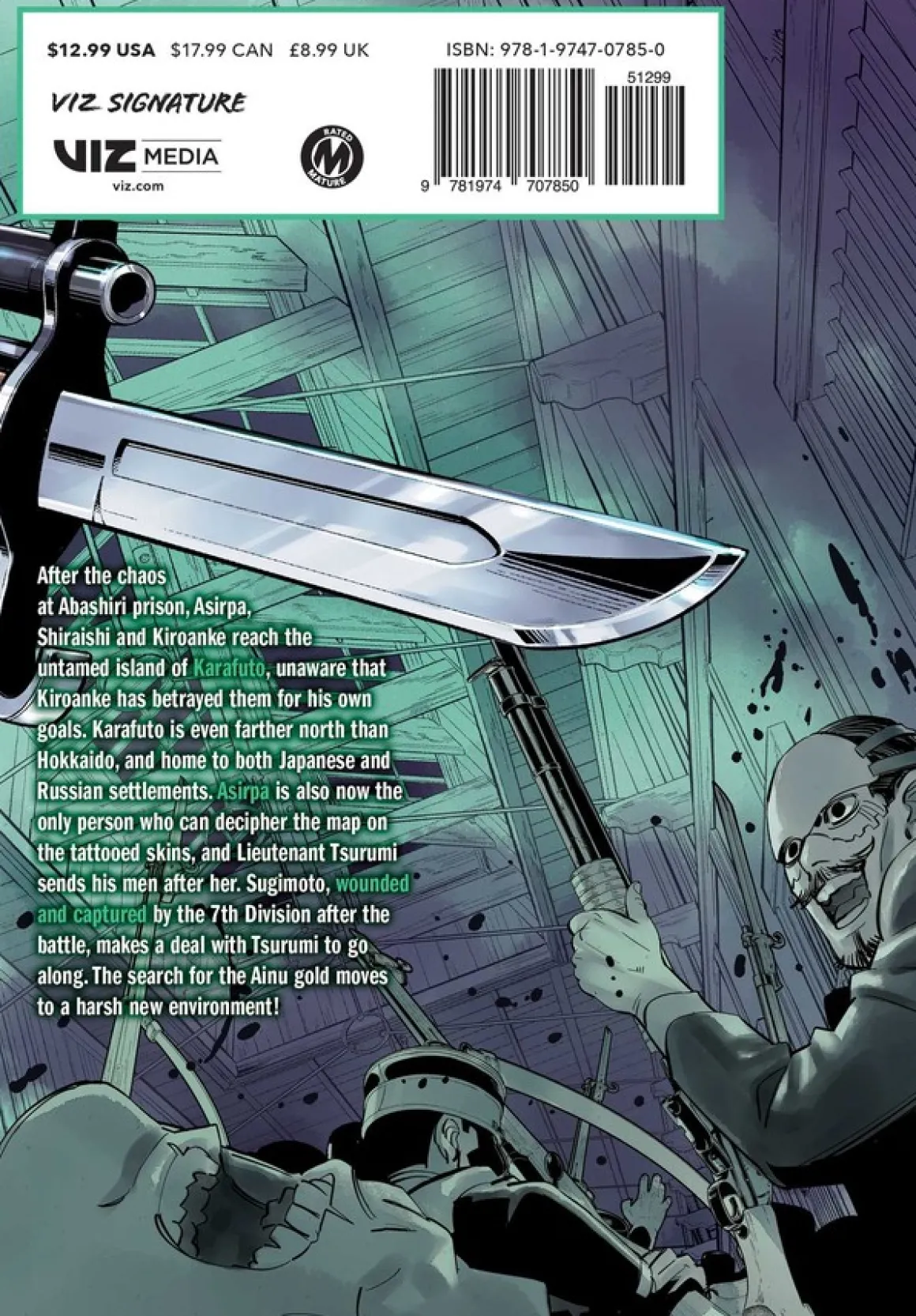 After the chaos at Abashiri prison, Asirpa, Shiraishi and Kiroanke head for Karafuto, unaware that Kiroranke has betrayed them for his own goals. The untamed island of Karafuto is even further north than Hokkaido, and home to both Japanese and Russian settlements. Asirpa is also now the only person who can decipher the map on the tattooed skins. Sugimoto, wounded and captured by the 7th Division after the battle, makes a deal with Tsurumi to go along. The search for the Ainu gold moves to a harsh new environment!