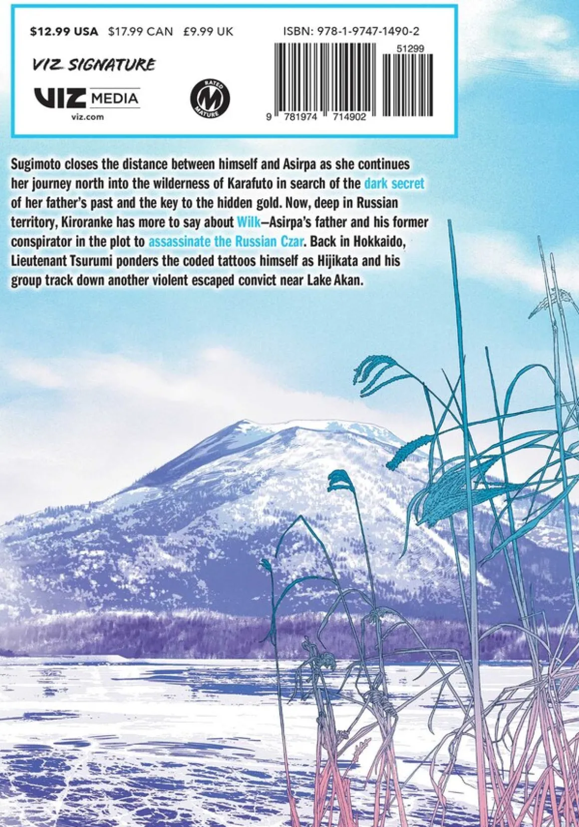 Sugimoto closes the distance between himself and Asirpa as she continues her journey north into the wilderness of Karafuto in search of the dark secret of her father’s past and the key to the hidden gold. Now, deep in Russian territory, Kiroranke has more to say about Wilk—Asirpa’s father and his former conspirator in the plot to assassinate the Russian Czar. Back in Hokkaido, Lieutenant Tsurumi ponders the coded tattoos himself as Hijikata and his group track down another violent escaped convict near Lake Akan.
