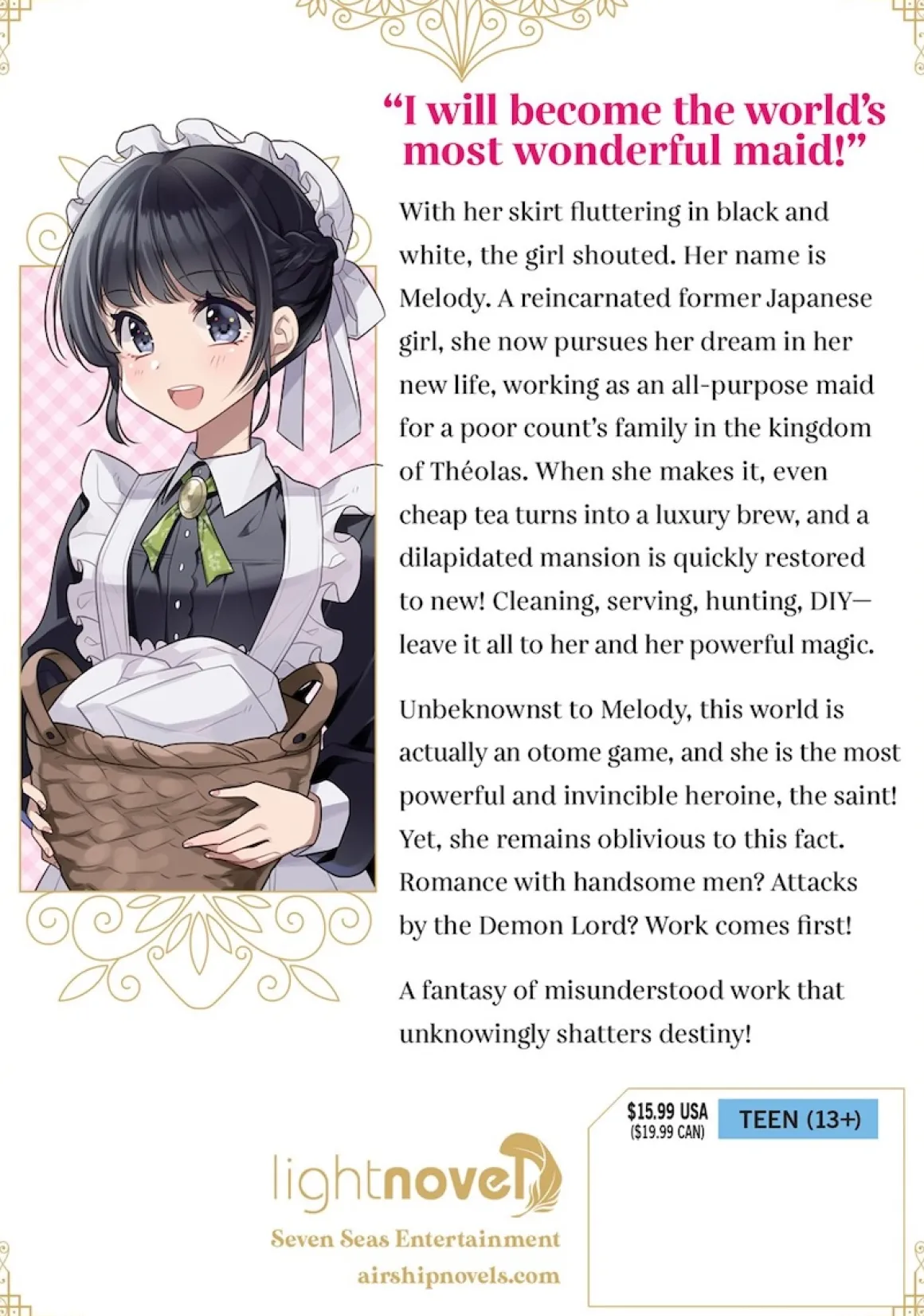 “I will become the world’s most wonderful maid!” With her skirt fluttering in black and white, the girl shouted. Her name is Melody. A reincarnated former Japanese girl, she now pursues her dream in her new life, working as an all-purpose maid for a poor count’s family in the kingdom of Théolas. When she makes it, even cheap tea turns into a luxury brew, and a dilapidated mansion is quickly restored to new! Cleaning, serving, hunting, DIY—leave it all to her and her powerful magic.