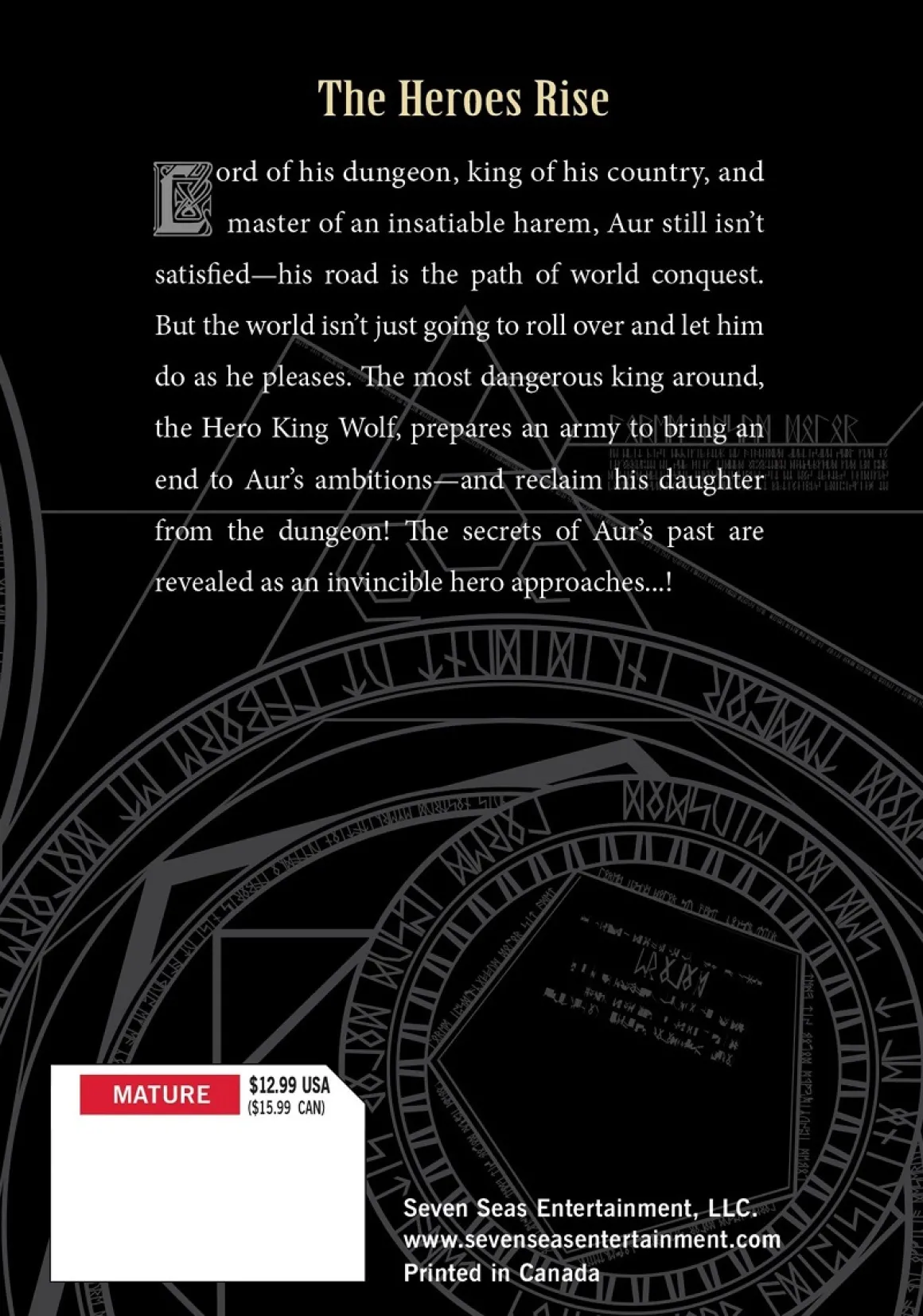 Lord of his dungeon, king of his country, and master of an insatiable harem, Aur still isn’t satisfied–his road is the path of world conquest. But the world isn’t just going to roll over and let him do as he pleases. The most dangerous king around, the Hero King Wolf, prepares an army to bring an end to Aur’s ambitions–and reclaim his daughter from the dungeon! The secrets of Aur’s past are revealed as an invincible hero approaches…!