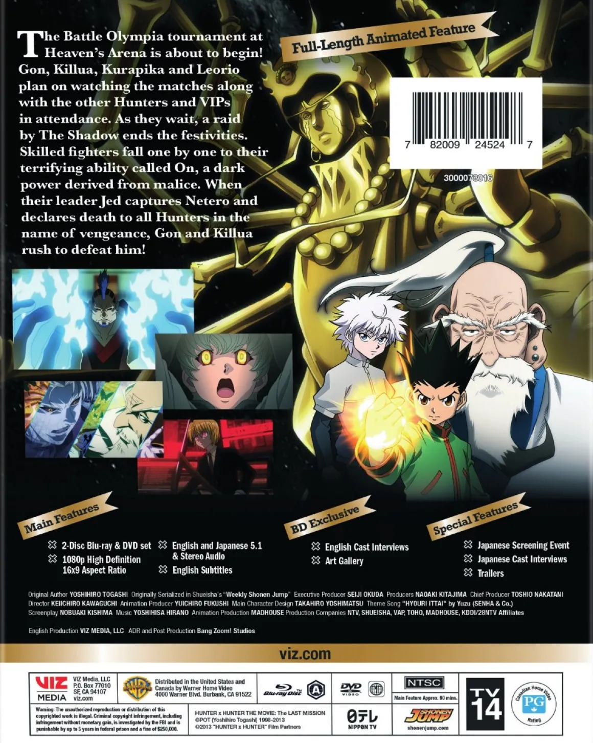The Battle Olympia tournament at Heaven’s Arena is about to begin! Gon, Killua, Kurapika and Leorio plan on watching the matches along with the other Hunters and VIPs in attendance. As they wait, a raid by The Shadow ends the festivities. Skilled fighters fall one by one to their terrifying ability called On, a dark power derived from malice. When their leader Jed captures Netero and declares death to all Hunters in the name of vengeance, Gon and Killua rush to defeat him!
