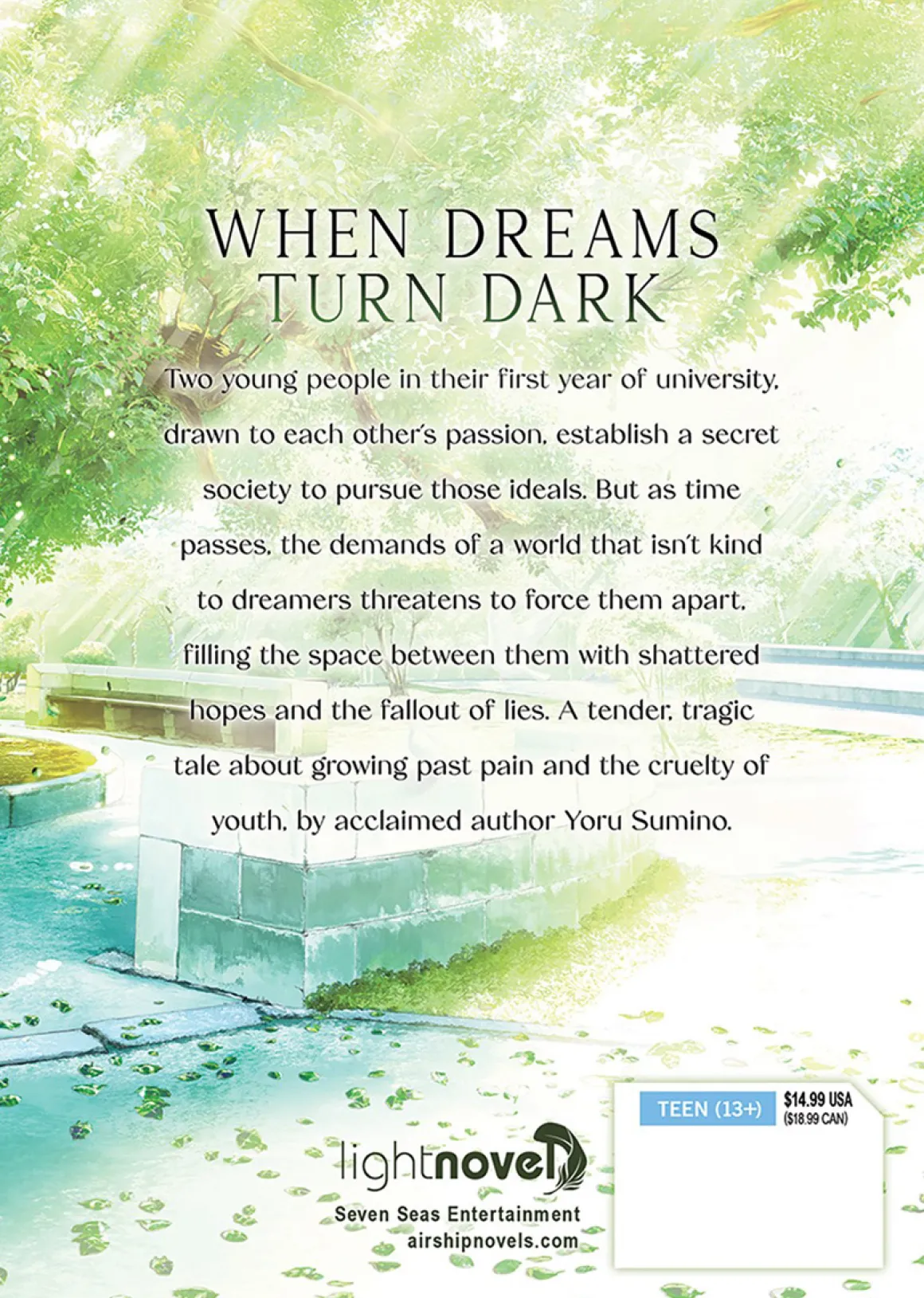 Two young people in their first year of university, drawn to each other’s passion, establish a secret society to pursue those ideals. But as time passes, the demands of a world that isn’t kind to dreamers threatens to force them apart, filling the space between them with shattered hopes and the fallout of lies. A tender, tragic tale about growing past pain and the cruelty of youth, by acclaimed author Yoru Sumino.