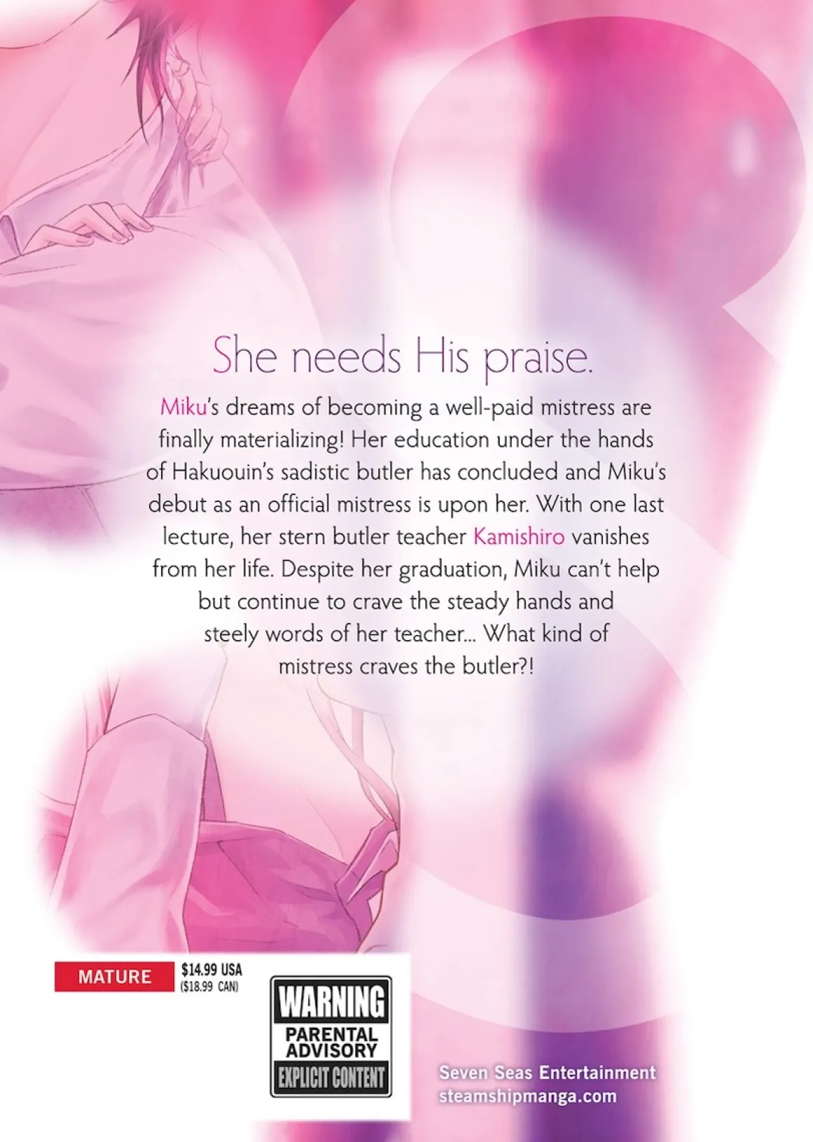 Miku’s dreams of becoming a well-paid mistress are finally materializing! Her education under the hands of Hakuouin’s sadistic butler has concluded and Miku’s debut as an official mistress is upon her. With one last lecture, her stern butler teacher Kamishiro vanishes from her life. Despite her graduation, Miku can’t help but continue to crave the steady hands and steely words of her teacher… What kind of mistress craves the butler?!