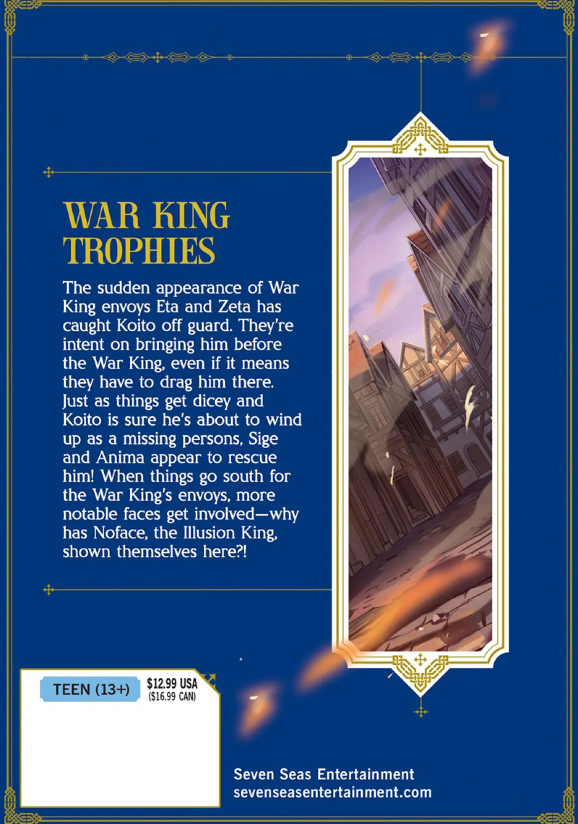 The sudden appearance of War King envoys Eta and Zeta has caught Koito off guard. They’re intent on bringing him before the War King, even if it means they have to drag him there. Just as things get dicey and Koito is sure he’s about to wind up as a missing persons, Sige and Anima appear to rescue him! When things go south for the War King’s envoys, more notable faces get involved–why has Noface, the Illusion King, shown themselves here?!