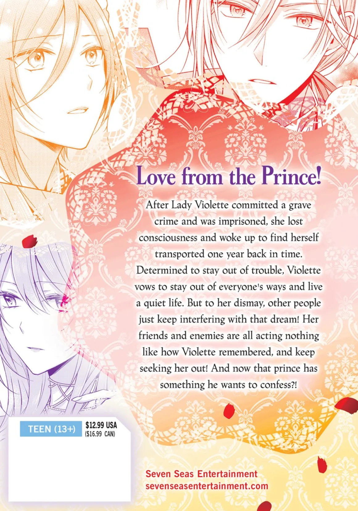After Lady Violette committed a grave crime and was imprisoned, she lost consciousness and woke up to find herself transported one year back in time. Determined to stay out of trouble, Violette vows to stay out of everyone’s ways and live a quiet life. But to her dismay, other people just keep interfering with that dream! Her friends and enemies are all acting nothing like how Violette remembered, and keep seeking her out! And now that prince has something he wants to confess?!