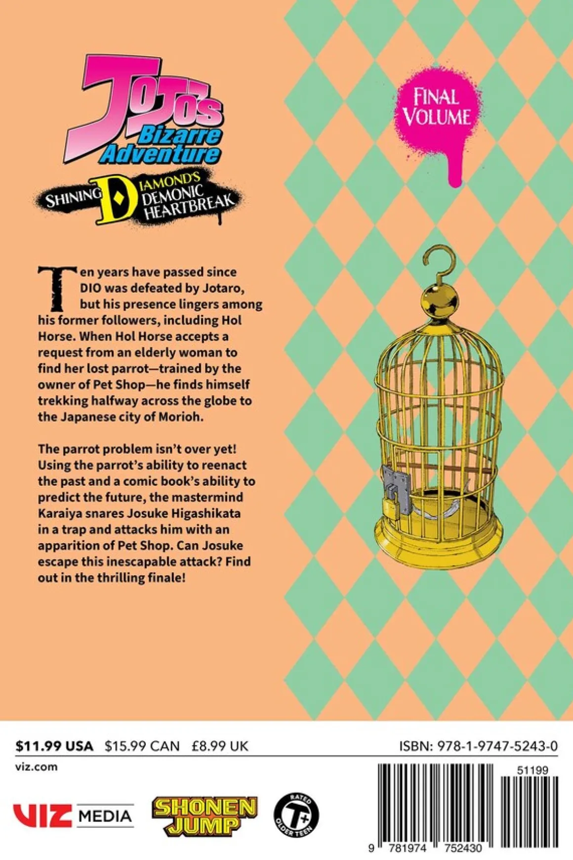 The parrot problem isn’t over yet! Using the parrot’s ability to reenact the past and a comic book’s ability to predict the future, the mastermind Karaiya snares Josuke Higashikata in a trap and attacks him with an apparition of Pet Shop. Can Josuke escape this inescapable attack? Find out the thrilling finale!