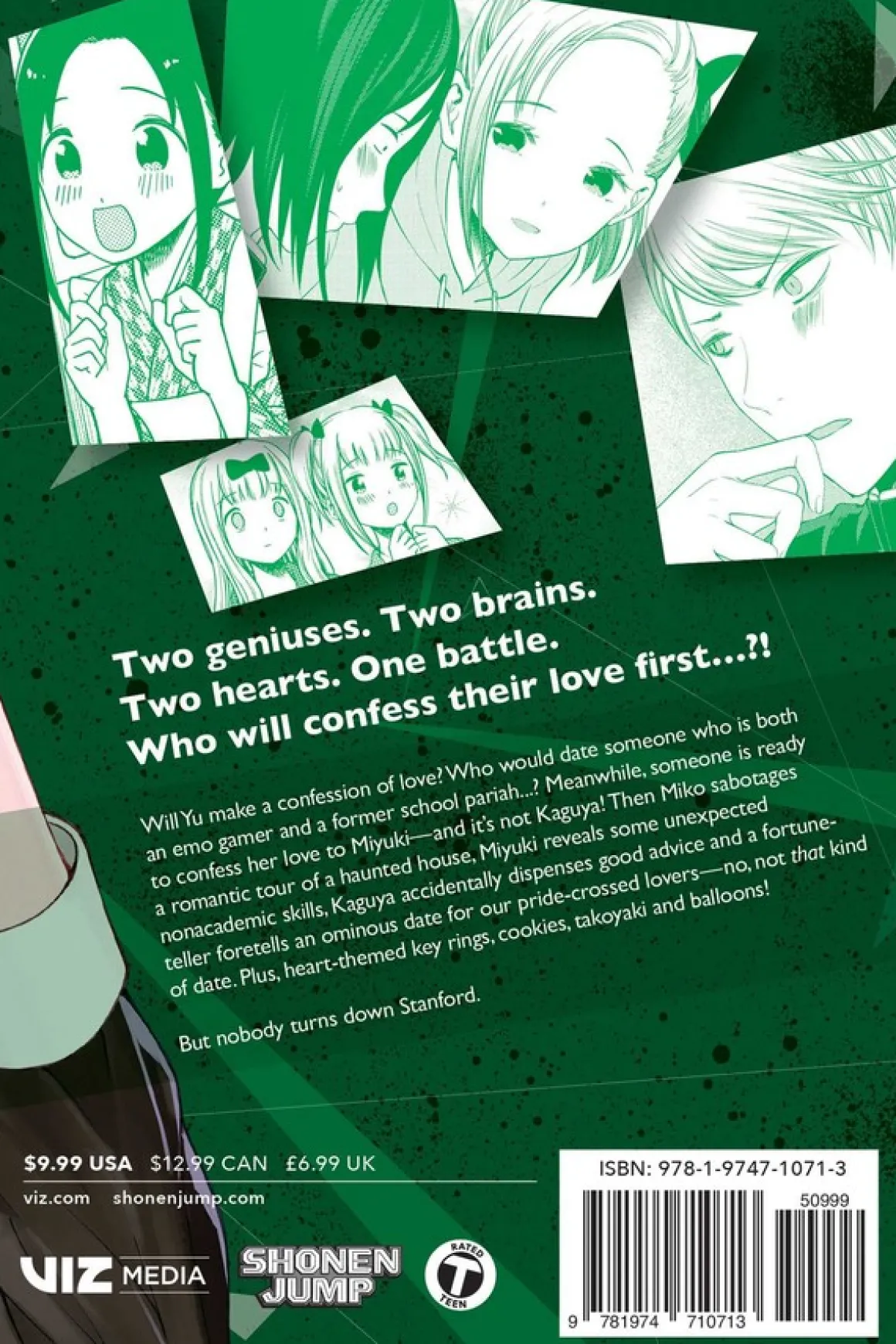 Will Yu make a confession of love? Who would date someone who is both an emo gamer and a former school pariah…? Meanwhile, someone is ready to confess her love to Miyuki—and it’s not Kaguya! Then Miko sabotages a romantic tour of a haunted house, Miyuki reveals some unexpected nonacademic skills, Kaguya accidentally dispenses good advice and a fortune-teller foretells an ominous date for our pride-crossed lovers—no, not that kind of date. Plus, heart-themed key rings, cookies, takoyaki and balloons!