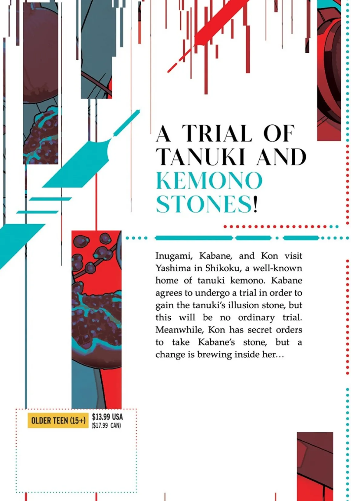 Inugami, Kabane, and Kon visit Yashima in Shikoku, a well-known home of tanuki kemono. Kabane agrees to undergo a trial in order to gain the tanuki’s illusion stone, but this will be no ordinary trial. Meanwhile, Kon has secret orders to take Kabane’s stone, but a change is brewing inside her…