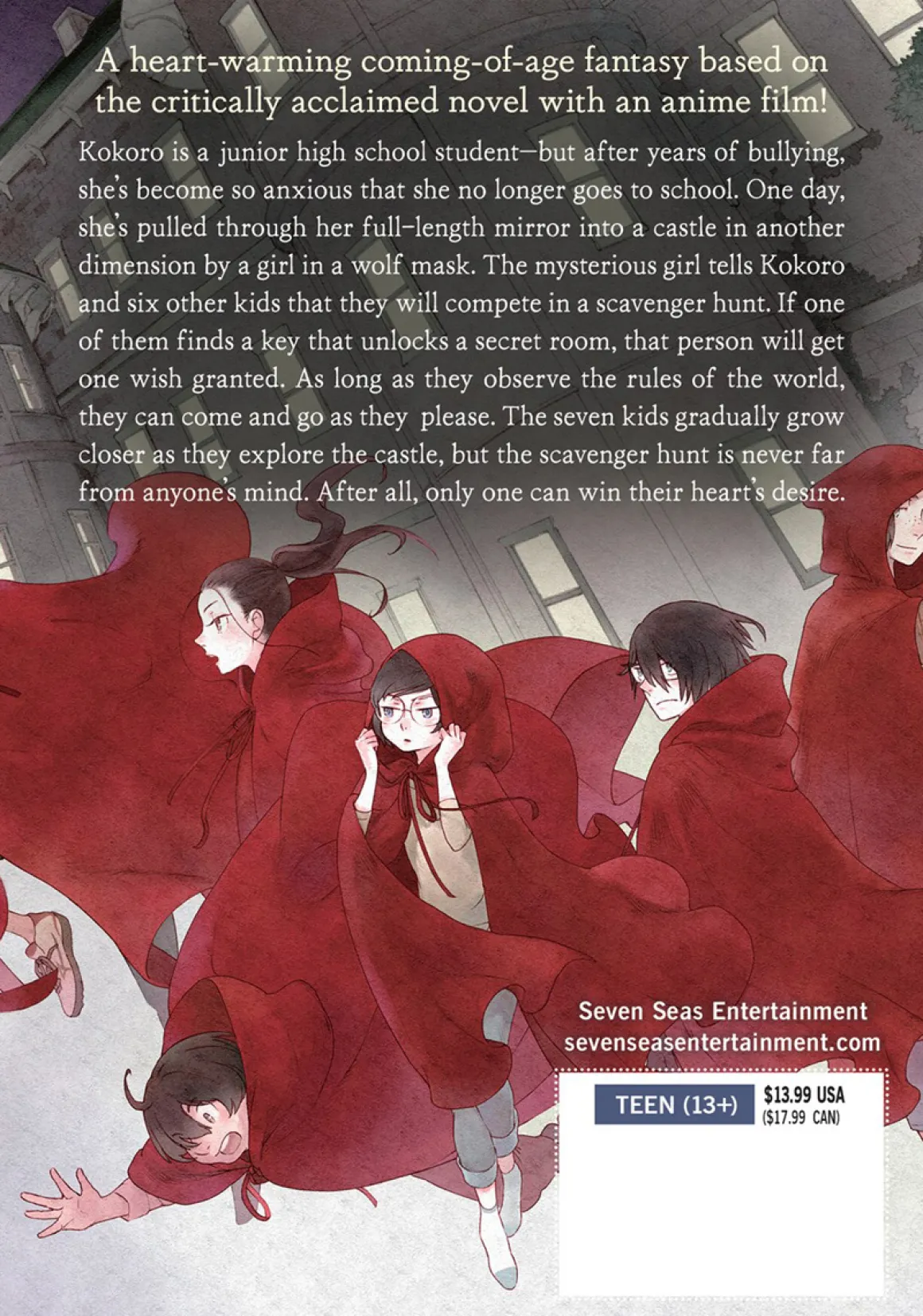 Kokoro is a junior high school student—but after years of bullying, she’s become so anxious that she no longer goes to school. One day, she’s pulled through her full-length mirror into a castle in another dimension by a girl in a wolf mask. The mysterious girl tells Kokoro and six other kids that they will compete in a scavenger hunt. If one of them finds a key that unlocks a secret room, that person will get one wish granted. As long as they observe the rules of the world, they can come and go as they please. The seven kids gradually grow closer as they explore the castle, but the scavenger hunt is never far from anyone’s mind. After all, only one can win their heart’s desire.