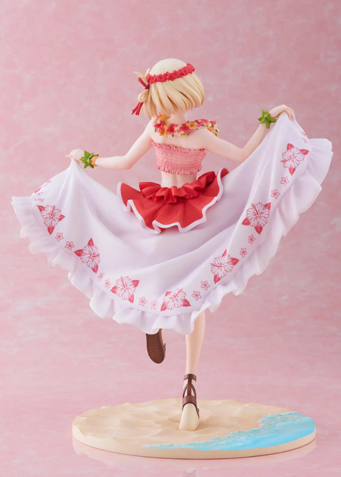 From the hit TV anime series Lycoris Recoil comes the lifelike Chisato Nishikigi 1/7 Scale Hawaii Version figure! Daintily holding the hem of her dress, Chisato’s smile shines bright like the sun. Her cheerful expression and lively dancing show how much she is enjoying Hawaii to the fullest. The vibrant red frills of her dress are a perfect match for Chisato’s energetic and sprightly demeanor. While her expression exudes a sense of innocence, the hem of her dress flows gently, exuding a sense of cuteness and elegance at the same time. The adornments, such as her Hawaiian lei and hair decorations, have been carefully crafted with close attention to the smallest details, down to the lines of the petals. The pedestal she stands on is reminiscent of gentle and spacious Hawaiian beaches; hear the waves and feel the sea breeze flow. Bring home Chisato in this candid shot as she enjoys Hawaii, alongside Takina, who is also enjoying her short vacation!