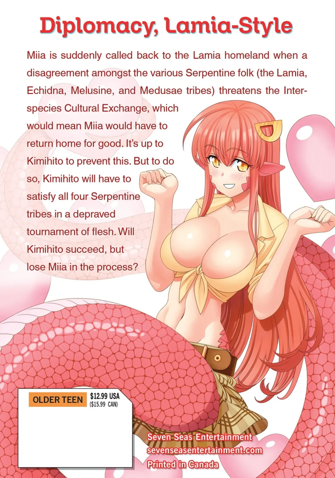Miia is suddenly called back to the Lamia homeland when a disagreement amongst the various Serpentine folk (the Lamia, Echidna, Melusine, and Medusae tribes) threatens the Interspecies Cultural Exchange, which would mean Miia would have to return home for good. It’s up to Kimihito to prevent this. But to do so, Kimihito will have to satisfy all four Serpentine tribes in a depraved tournament of flesh. Will Kimihito succeed, but lose Miia in the process?