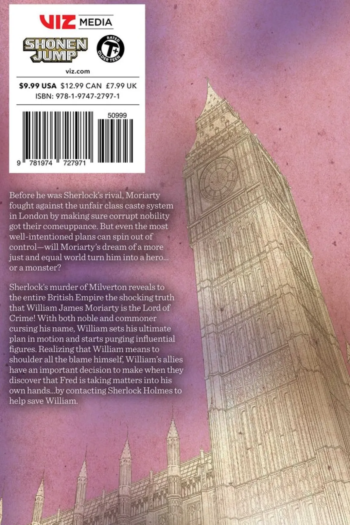 Sherlock’s murder of Milverton reveals to the entire British Empire the shocking truth that William James Moriarty is the Lord of Crime! With both nobles and commoners cursing his name, William sets his ultimate plan in motion and starts purging influential figures. Realizing that he means to shoulder all the blame himself, William’s allies have an important decision to make when they discover that Fred is taking matters into his own hands…by contacting Sherlock Holmes to help save William.