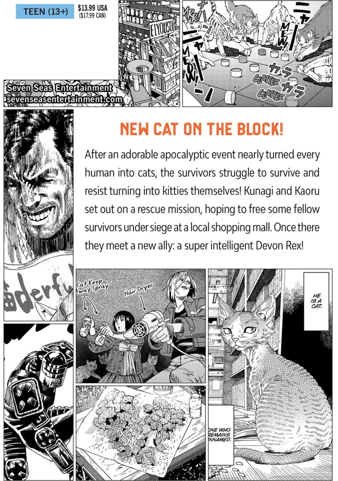 After an adorable apocalyptic event nearly turned every human into cats, the survivors struggle to survive and resist turning into kitties themselves! Kunagi and Kaoru set out on a rescue mission, hoping to free some fellow survivors under siege at a local shopping mall. Once there they meet a new ally: a super intelligent Devon Rex!