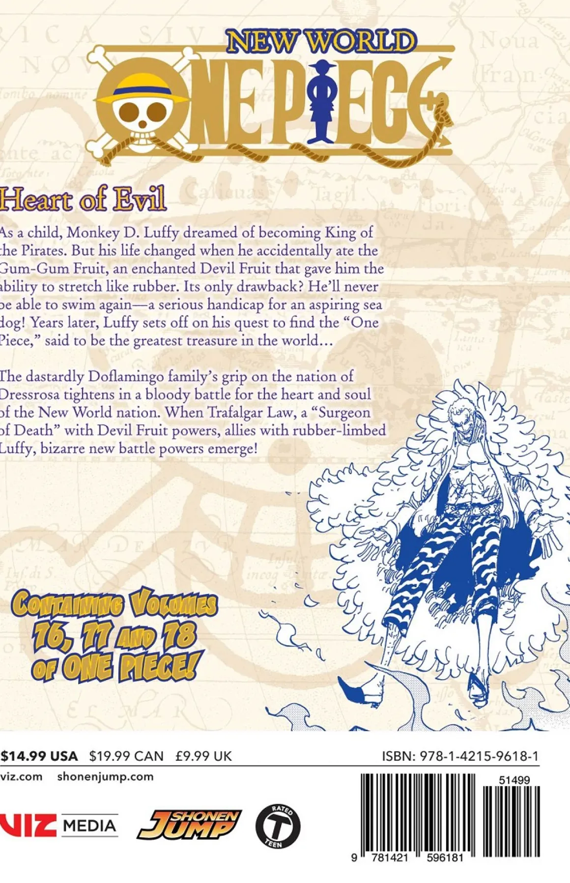 The dastardly Doflamingo family’s grip on the nation of Dressrosa tightens in a bloody battle for the heart and soul of the New World nation. When Trafalgar Law, a “Surgeon of Death” with Devil Fruit powers, allies with rubber-limbed Luffy, bizarre new battle powers emerge!