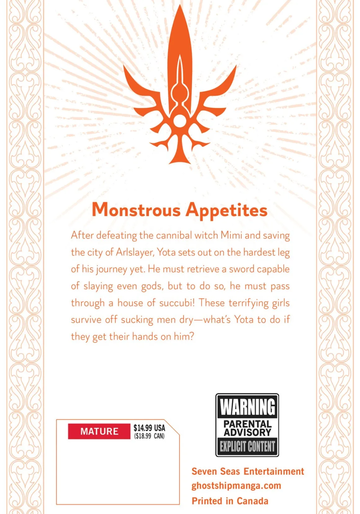 After defeating the cannibal witch Mimi and saving the city of Arlslayer, Yota sets out on the hardest leg of his journey yet. He must retrieve a sword capable of slaying even gods, but to do so, he must pass through a house of succubi! These terrifying girls survive off sucking men dry—what’s Yota to do if they get their hands on him?