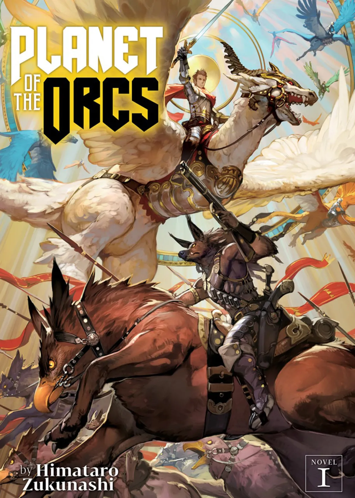 Planet of the Orcs Novel Volume 1 was written by Himataro Zukunashi with cover illustration by Toshiaki Takayama.