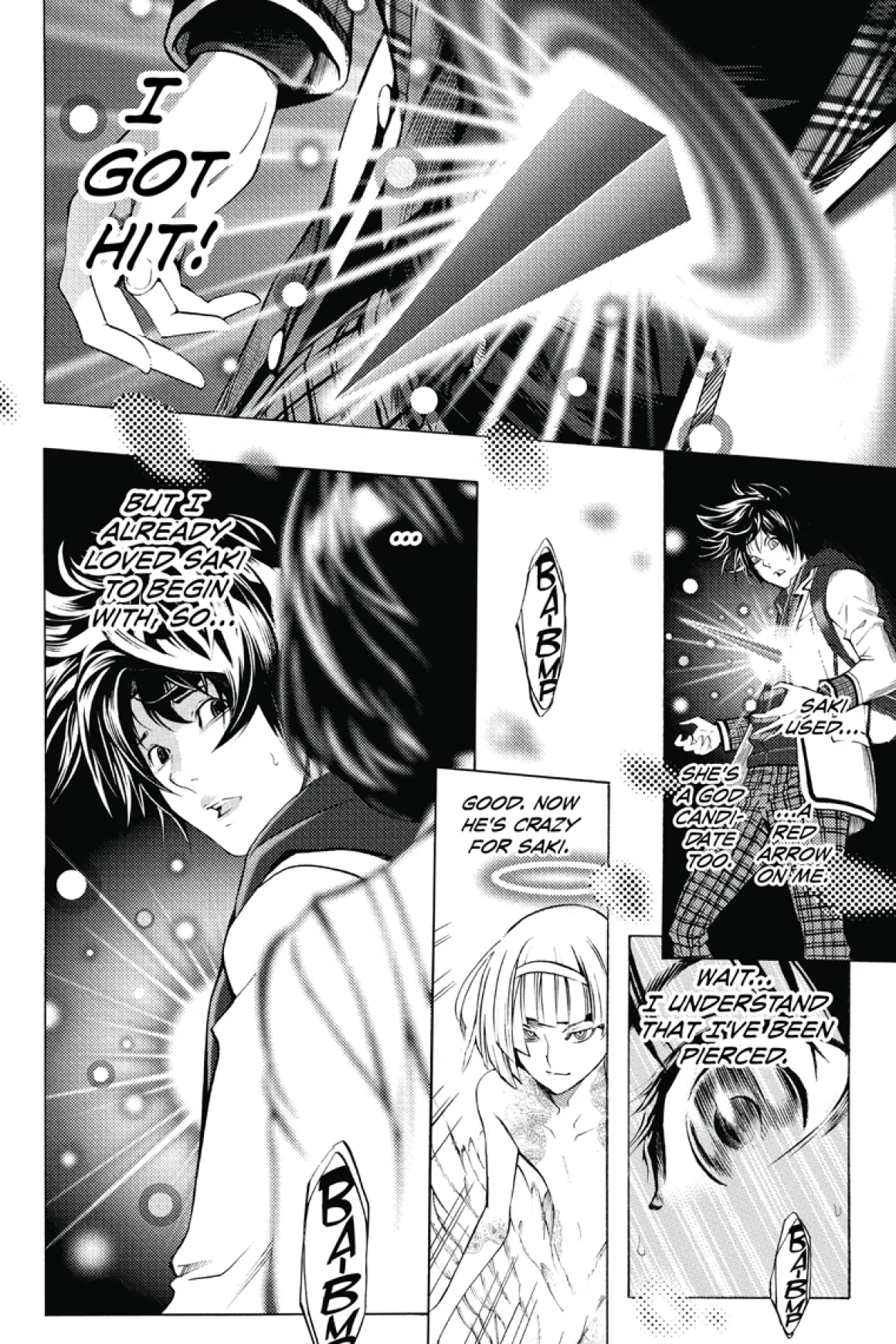 Mirai is suddenly pierced by a red arrow from a god candidate who just happens to be the girl he has a crush on! Now under her control for the next 33 days, what will happen to Mirai? And what is the mysterious Metropoliman really up to?