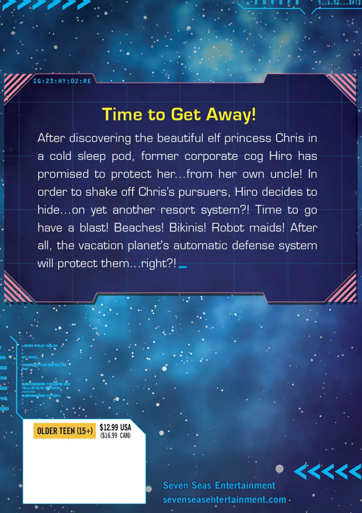 After discovering the beautiful elf princess Chris in a cold sleep pod, former corporate cog Hiro has promised to protect her…from her own uncle! In order to shake off Chris’s pursuers, Hiro decides to hide…on yet another resort system?! Time to go have a blast! Beaches! Bikinis! Robot maids! After all, the vacation planet’s automatic defense system will protect them…right?!