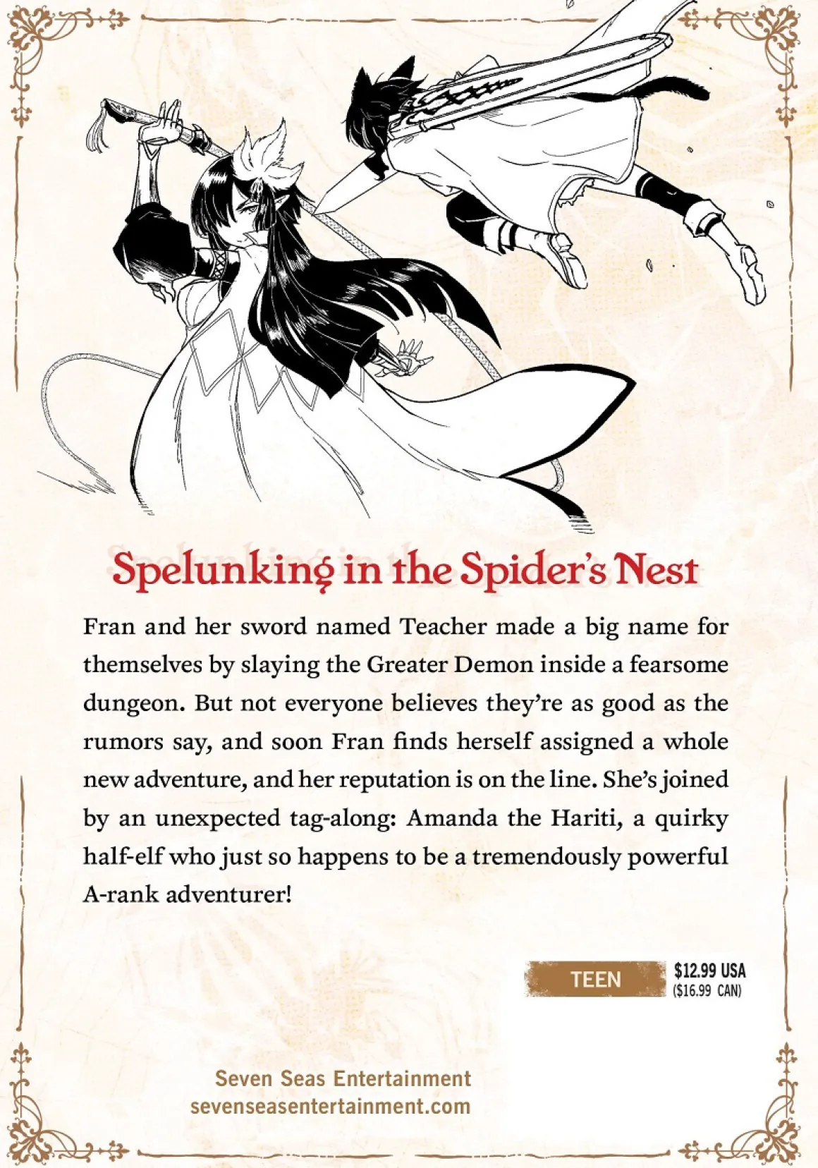 Fran and her sword named Teacher made a big name of themselves slaying the Greater Demon inside a fearsome dungeon. But not everyone believes they’re as good as the rumors say, and soon Fran finds herself assigned a whole new adventure, and her reputation is on the line. She’s joined by an unexpected tagalong: Amanda the Hariti, a quirky half-elf who just so happens to be a tremendously powerful A-rank adventurer!