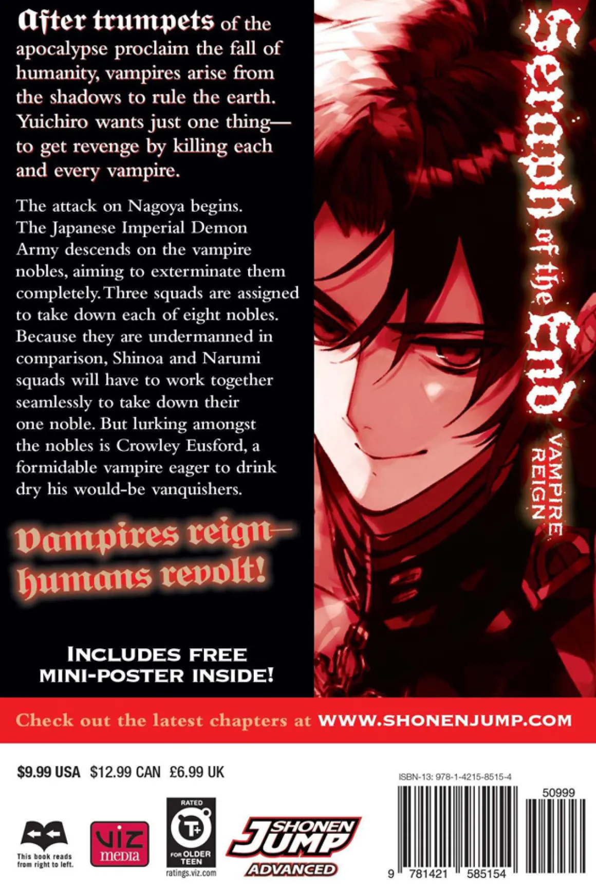 The attack on Nagoya begins in Seraph of the End volume 8! The Japanese Imperial Demon Army descends on the vampire nobles, aiming to exterminate them completely. Three squads are assigned to take down each of eight nobles. Because they are undermanned in comparison, Shinoa and Narumi squads will have to work together seamlessly to take down their one noble. But lurking amongst the nobles is Crowley Eusford, a formidable vampire eager to drink dry his would-be vanquishers.