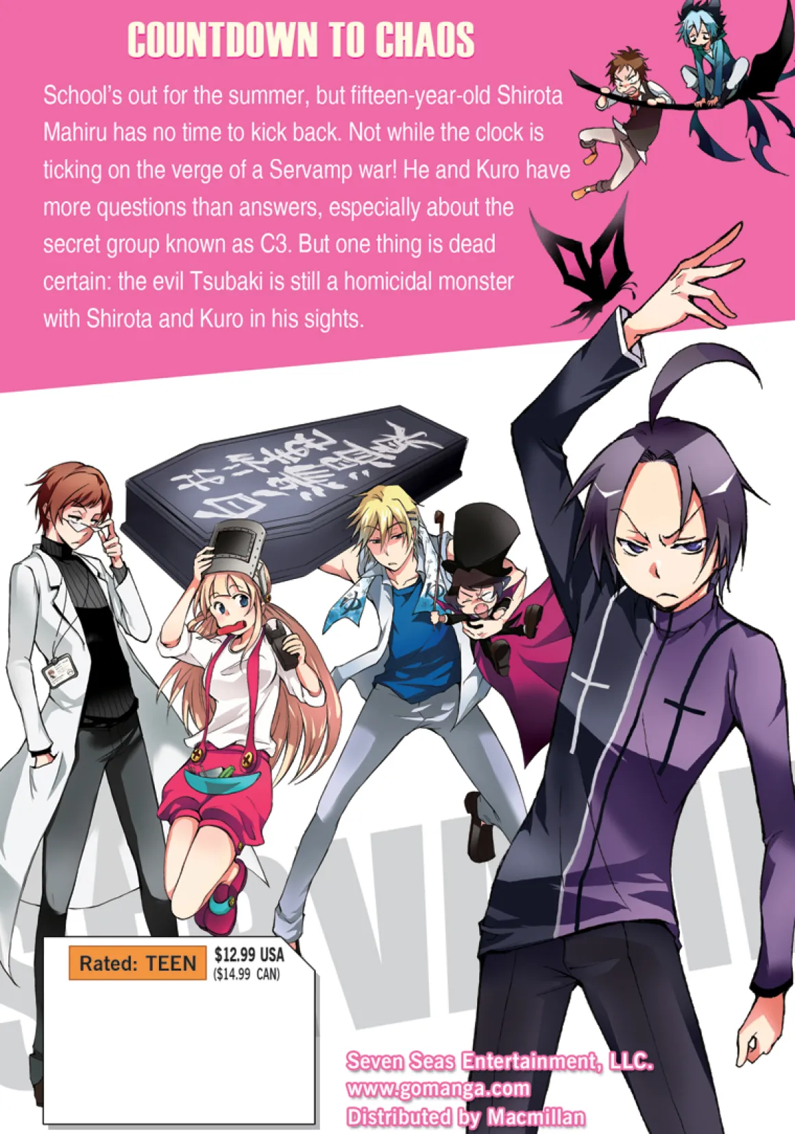 School’s out for the summer, but fifteen-year-old Shirota Mahiru has no time to kick back. Not while the clock is ticking on the verge of a Servamp war! He and Kuro have more questions than answers, especially about the secret group known as C3. But one thing is dead certain: the evil Tsubaki is still a homicidal monster with Shirota and Kuro in his sights.