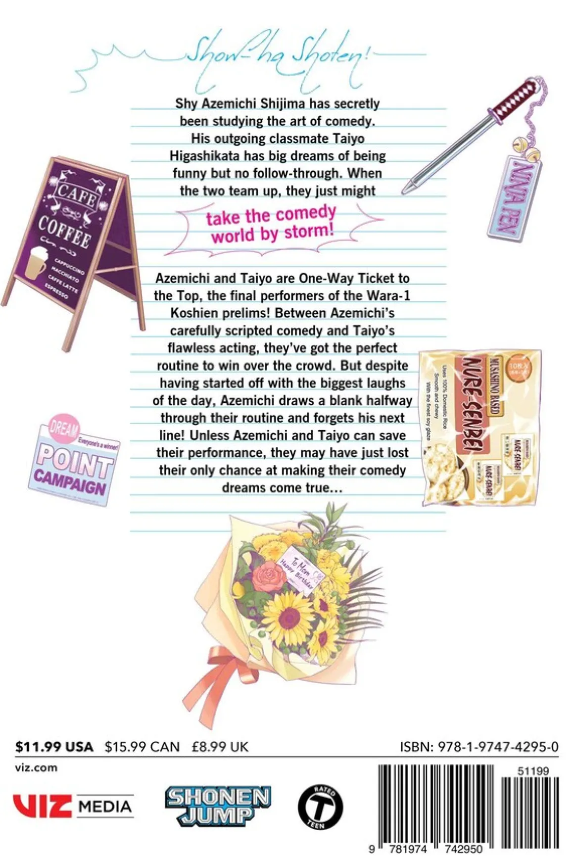 Azemichi and Taiyo are One-Way Ticket to the Top, the final performers of the Wara-1 Koshien prelims! Between Azemichi’s carefully scripted comedy and Taiyo’s flawless acting, they’ve got the perfect routine to win over the crowd. But despite starting off with the biggest laughs of the day, Azemichi draws a blank halfway through their routine and forgets his next line! Unless Azemichi and Taiyo can save their performance, they may have just lost their only chance at making their comedy dreams come true…
