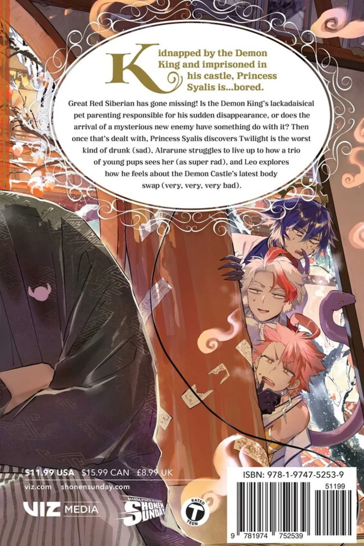 Great Red Siberian has gone missing! Is the Demon King’s lackadaisical pet parenting responsible for his sudden disappearance, or does the arrival of a mysterious new enemy have something to do with it? Then once that’s dealt with, Princess Syalis discovers Twilight is the worst kind of drunk (sad), Alraune struggles to live up to how a trio of young pups sees her (as super rad), and Leo explores how he feels about the Demon Castle’s latest body swap (very, very, very bad).