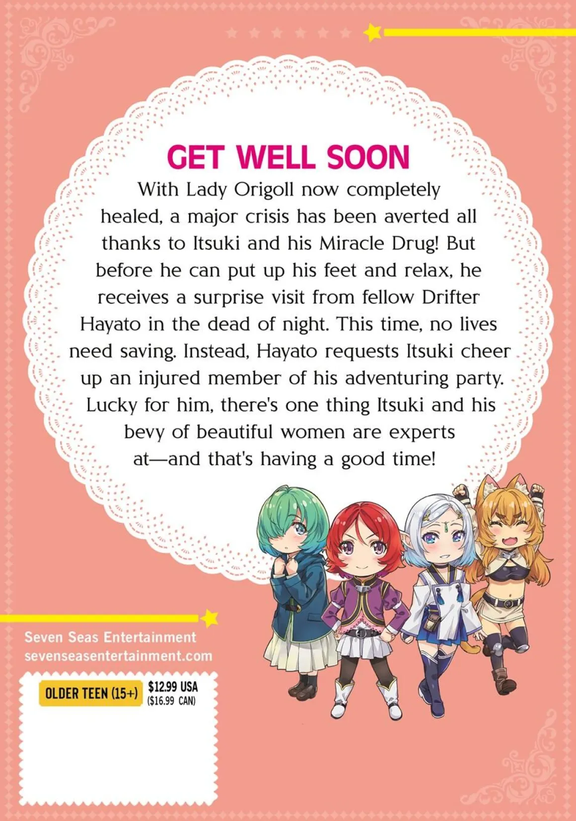With Lady Origoll now completely healed, a major crisis has been averted all thanks to Itsuki and his Miracle Drug! But before he can put up his feet and relax, he receives a surprise visit from fellow Drifter Hayato in the dead of night. This time, no lives need saving. Instead, Hayato requests Itsuki cheer up an injured member of his adventuring party. Lucky for him, there’s one thing Itsuki and his bevy of beautiful women are experts at—and that’s having a good time!