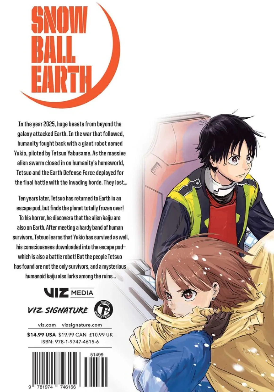 Upon his return to Earth, Tetsuo finds the planet frozen over. Much to his surprise and horror, he discovers that the alien kaiju have made it to Earth too. But after meeting a hardy band of human survivors, Tetsuo learns that Yukio has survived as well, his consciousness downloaded into the escape pod—which also happens to be a battle robot! Now headed for the survivors’ stronghold, Tetsuo is determined to make new friends. But the people Tetsuo has found are not the only ones left, and a mysterious humanoid kaiju also lurks among the ruins.