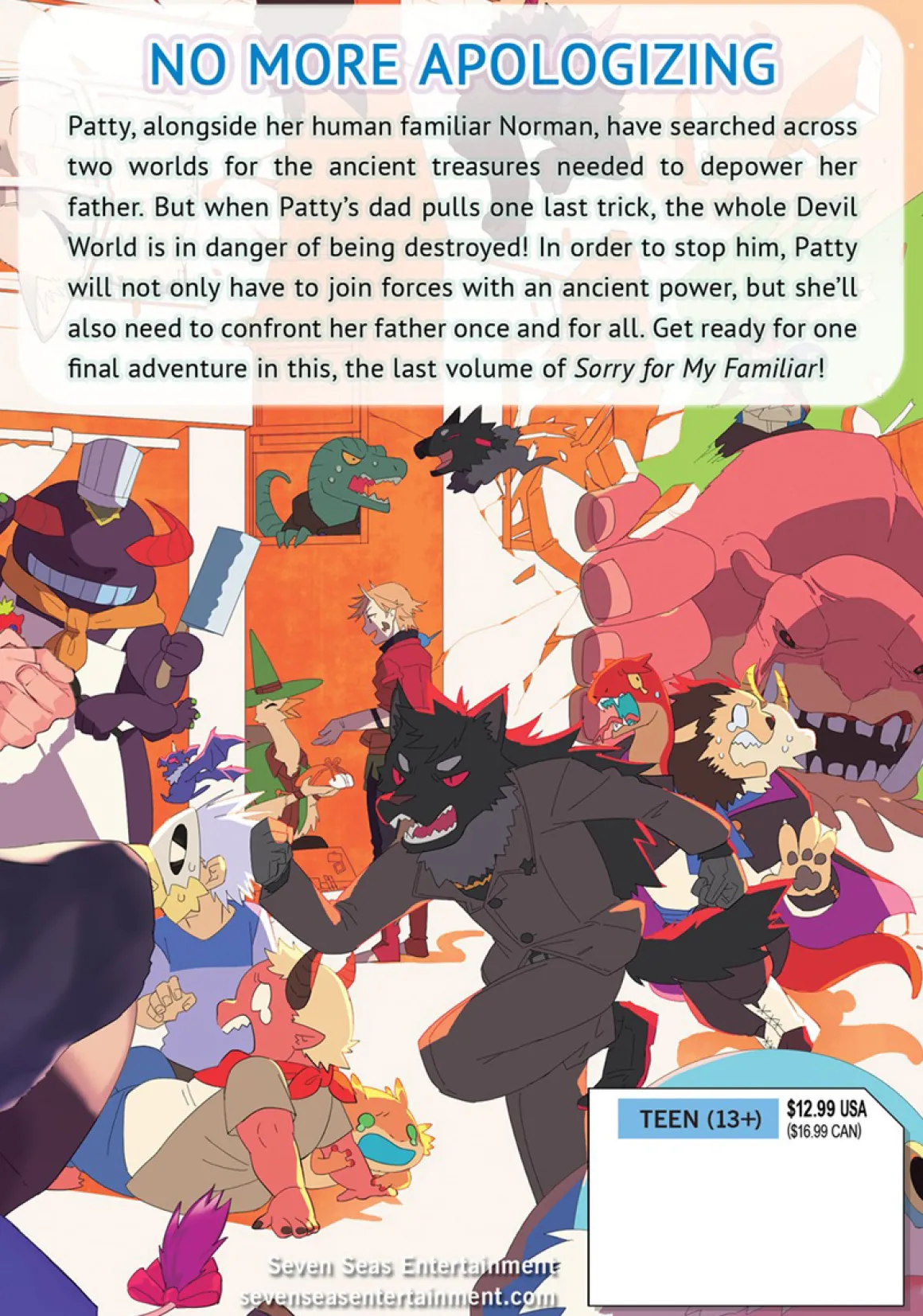 Patty, alongside her human familiar Norman, have searched across two worlds for the ancient treasures needed to depower her father. But when Patty’s dad pulls one last trick, the whole Devil World is in danger or being destroyed! In order to stop him, Patty will not only have to join forces with an ancient power, but she’ll also need to confront her father once and for all. Get ready for one final adventure in this, the last volume of Sorry For My Familiar!