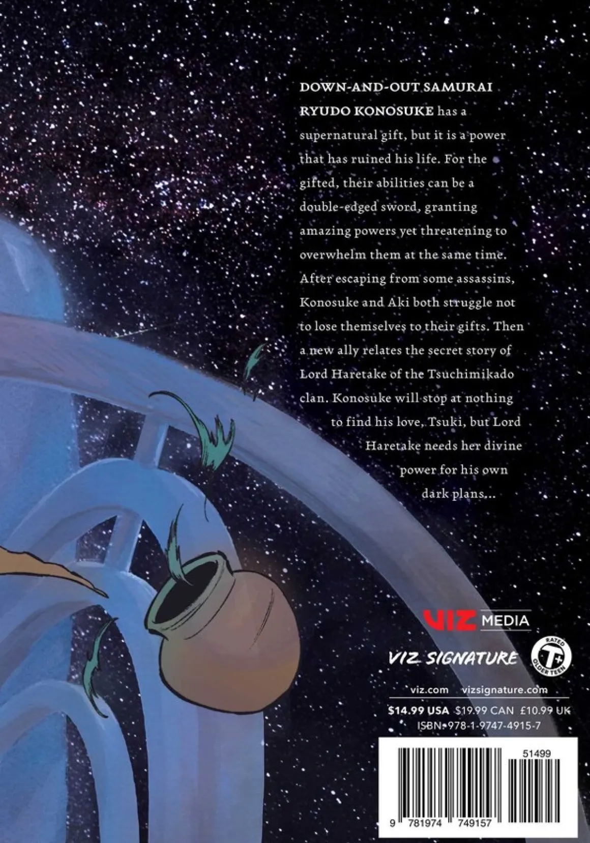 After escaping from some assassins, Konosuke and Aki both struggle not to lose themselves to their gifts. Then a new ally relates the secret story of Lord Haretake of the Tsuchimikado clan. Konosuke will stop at nothing to find his love, Tsuki, but Lord Haretake needs her divine power for his own dark plans…