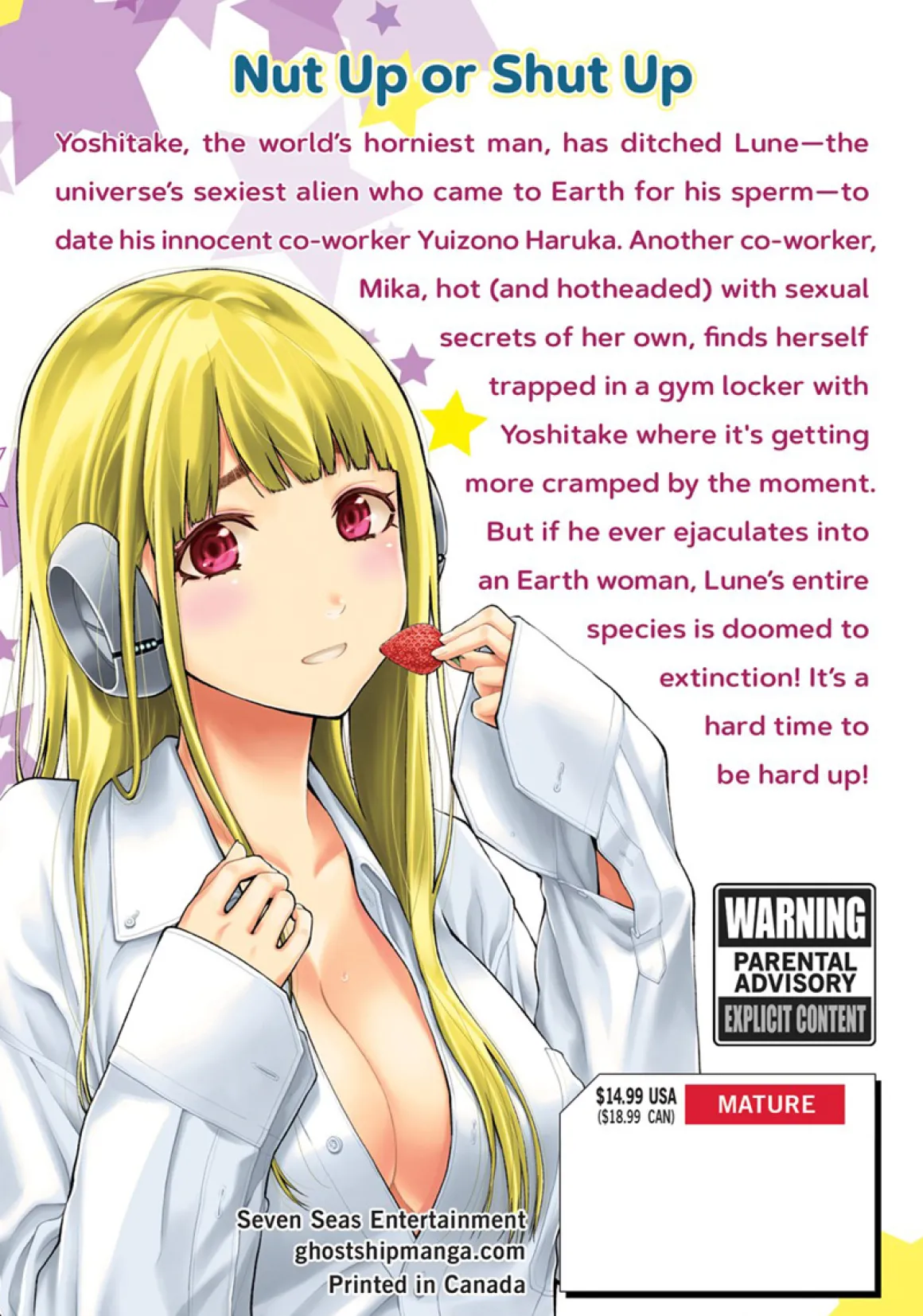 Yoshitake has ditched Lune—the universe’s sexiest alien who came to Earth for his seed—to date his innocent co-worker Yuizono Haruka. Another co-worker, Mika, is hot (and hotheaded) with secrets of her own, finds herself trapped in a gym locker with Yoshitake where it’s getting more cramped by the moment. Lune’s entire species is doomed to extinction! It’s a hard time to be hard up!