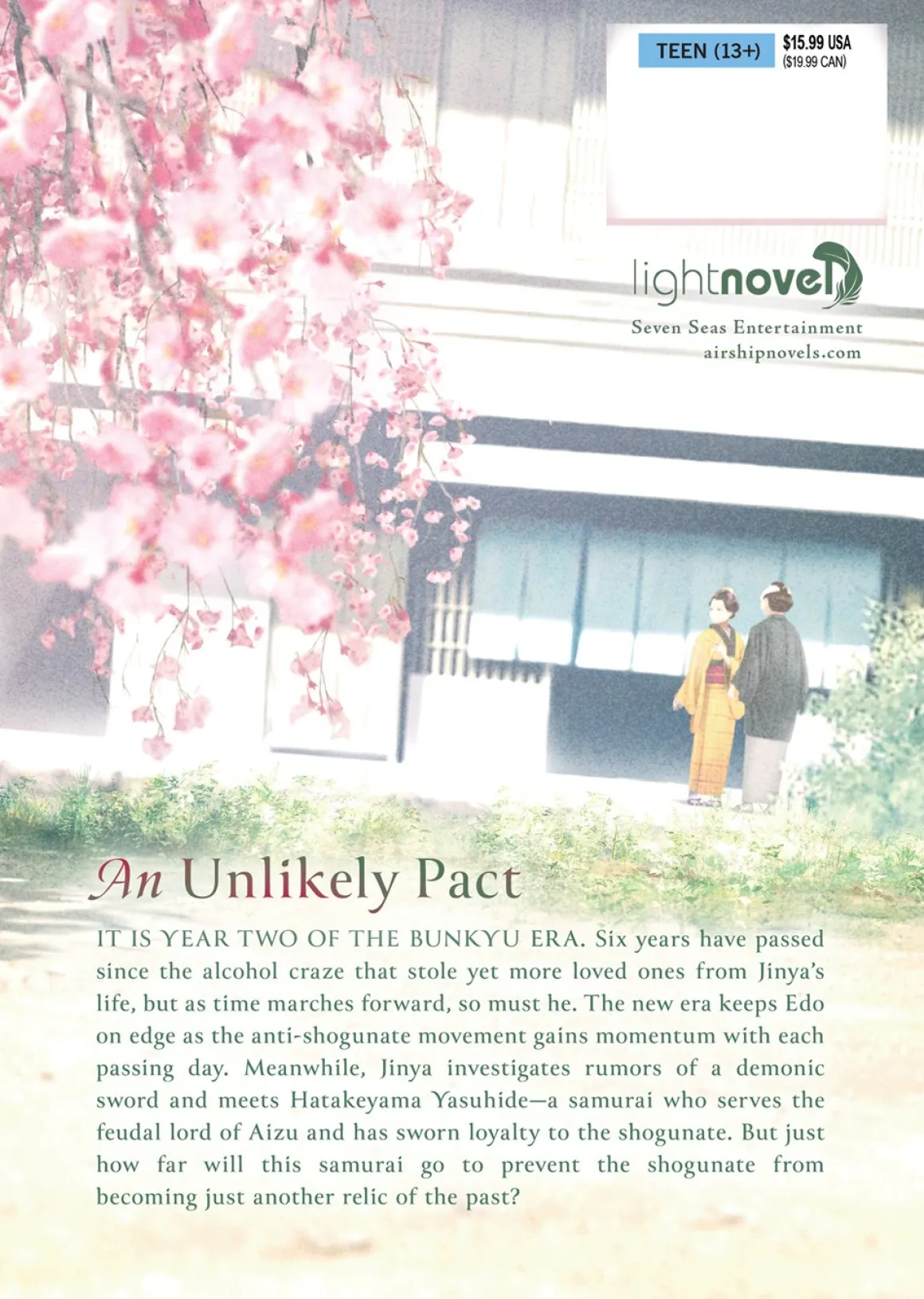 It is year two of the Bunkyu era. Six years have passed since the alcohol craze that stole yet more loved ones from Jinya’s life, but as time marches forward, so must he. The new era keeps Edo on edge as the anti-shogunate movement gains momentum with each passing day. Meanwhile, Jinya investigates rumors of a demonic sword and meets Hatakeyama Yasuhide—a samurai who serves the feudal lord of Aizu and has sworn loyalty to the shogunate. But just how far will this samurai go to prevent the shogunate from becoming just another relic of the past?