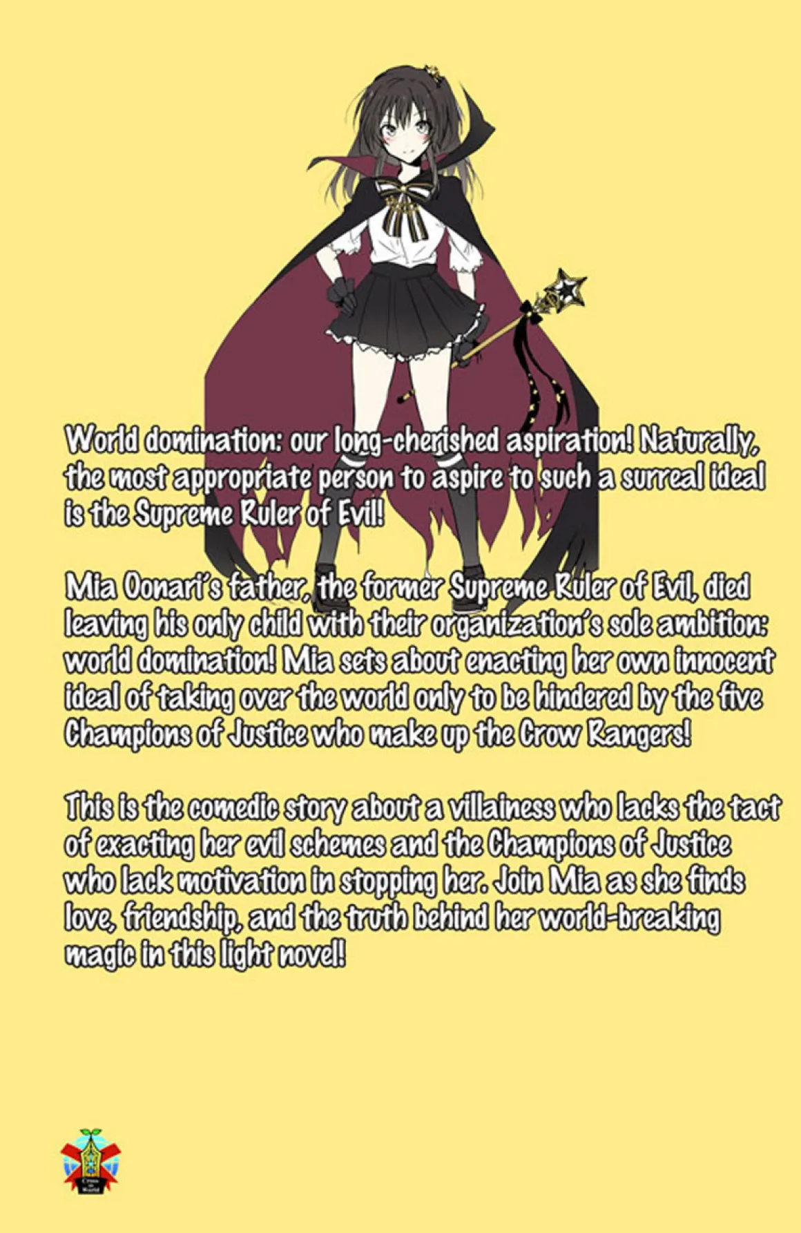 This is the comedic story about a villainess who lacks the tact of exacting her evil schemes and the Champions of Justice who lack motivation in stopping her. Join Mia as she finds love, friendship, and the truth behind her world-breaking magic in this light novel!